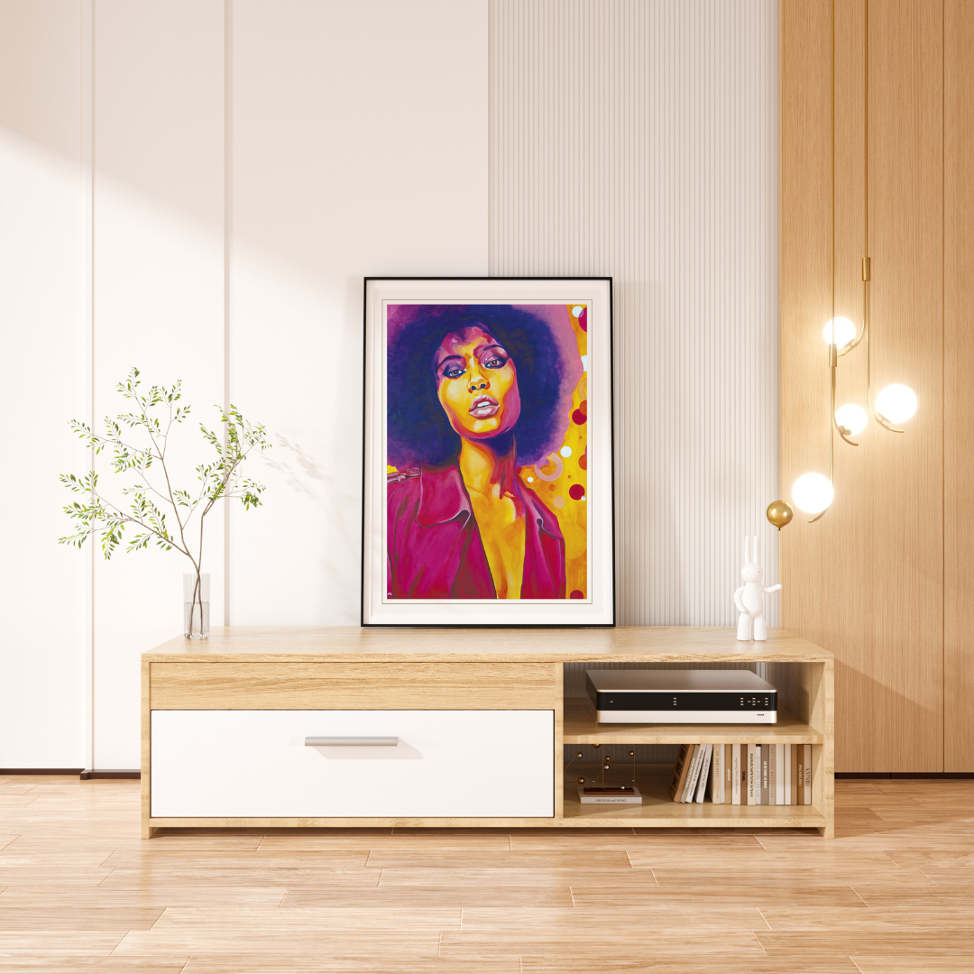 ציור מלא בצבעוניות דומיננטית, דמות האישה בציור מלאה ביופי, נוכחות, מביטה ישירות אל הצופה ומעבירה תחושות מגוונות