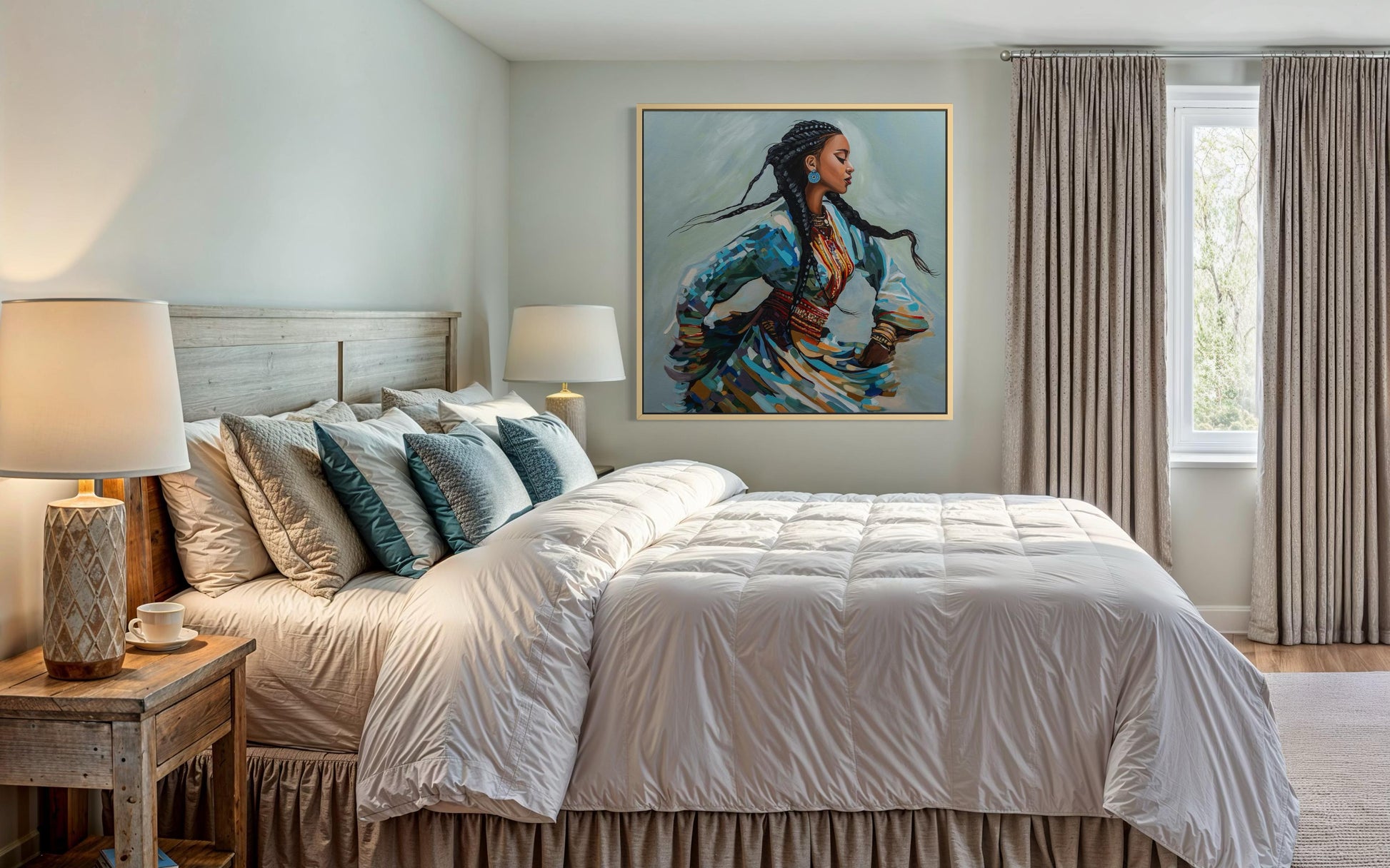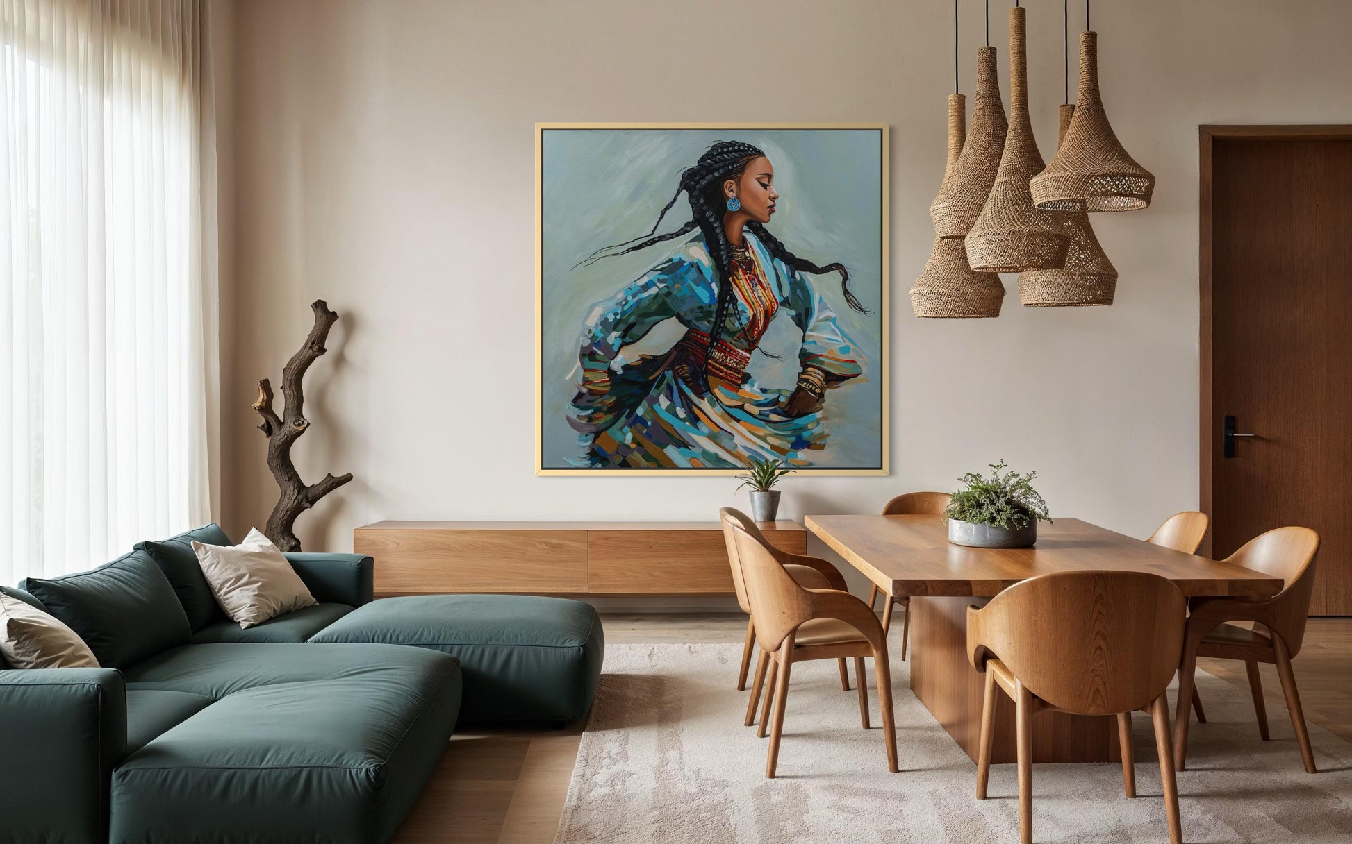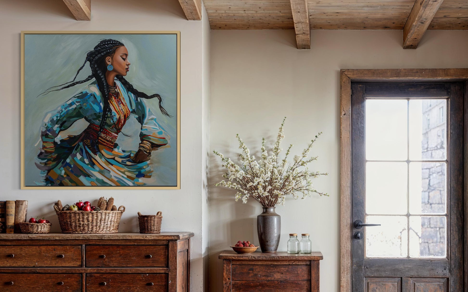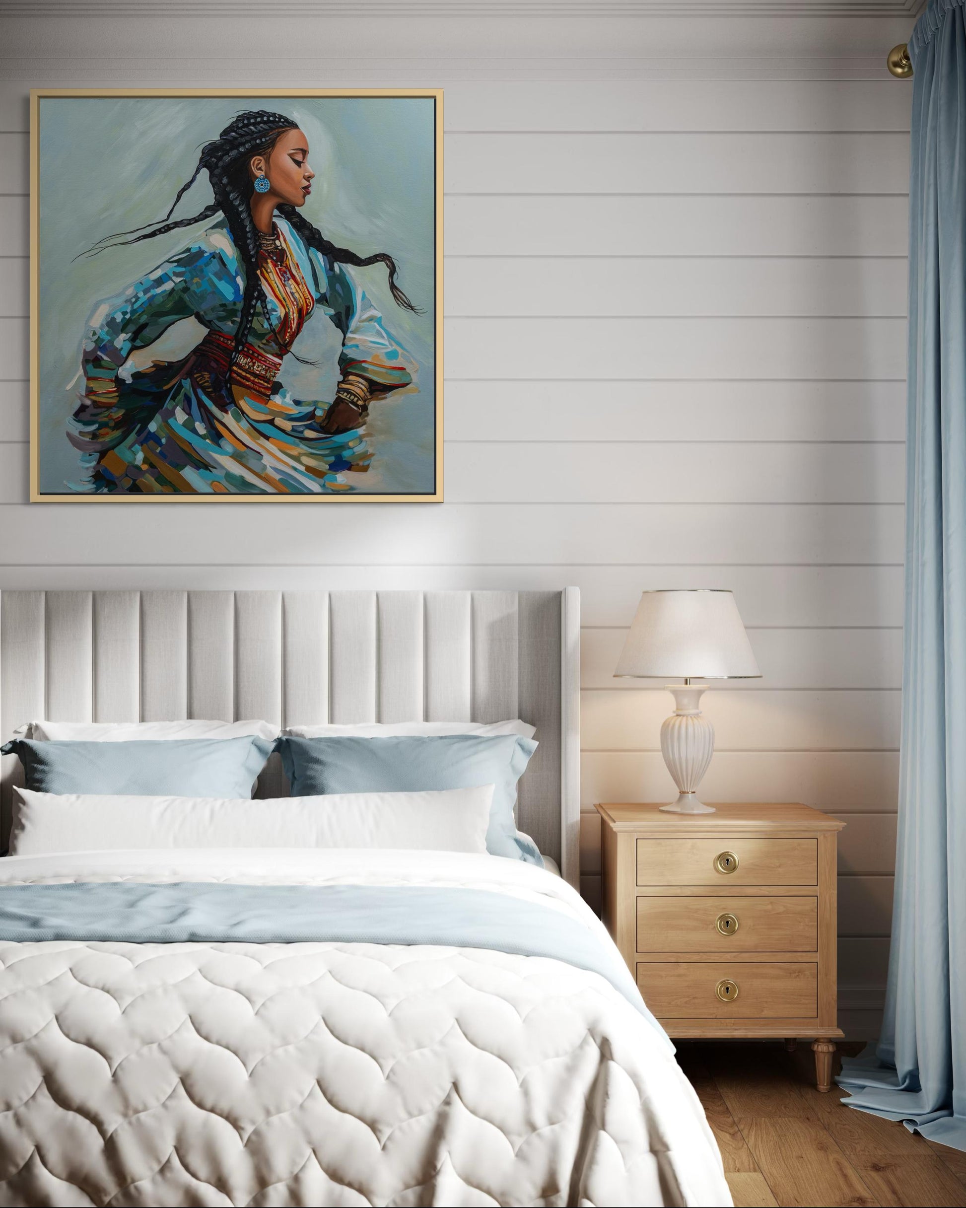 ציור מתוך סדרת 'מחול החיים'. יצירה החוגגת נשיות, תנועה ועוצמה תרבותית. צבעים חמים ועשירים מדגישים רגע של זרימה פנימית וגאווה שורשית, ומכניסים לחלל אנרגיה וחיים