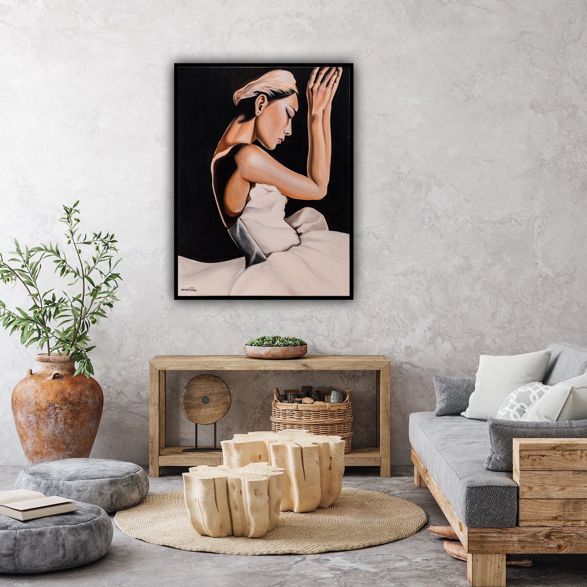 A dancer with eyes closed, arms raised. Her orange headband subtly ignites the composition with warmth and determination, symbolizing quiet strength and elegance.