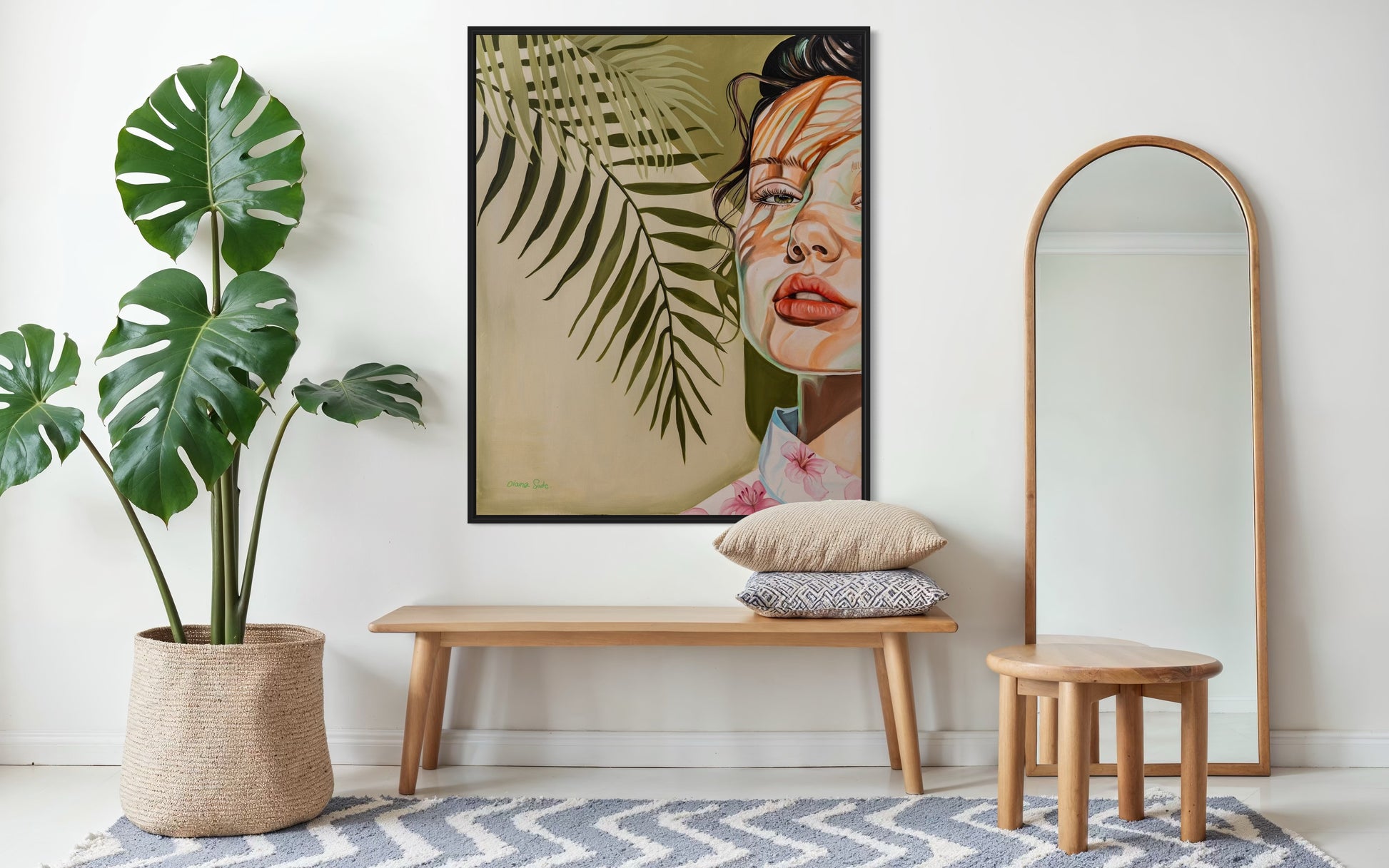 Size matters! Artwork has presence and affects the atmosphere in a space. The size of the artwork is significant, and its size does matter when it comes to visual impact. If the space is large, it’s recommended to choose a painting in a suitable size that won’t disappear within the room. You can consider combining two paintings or creating a wall collage. Pay attention to what you love about the size of the artwork and how it complements the room’s overall design and visual appeal.