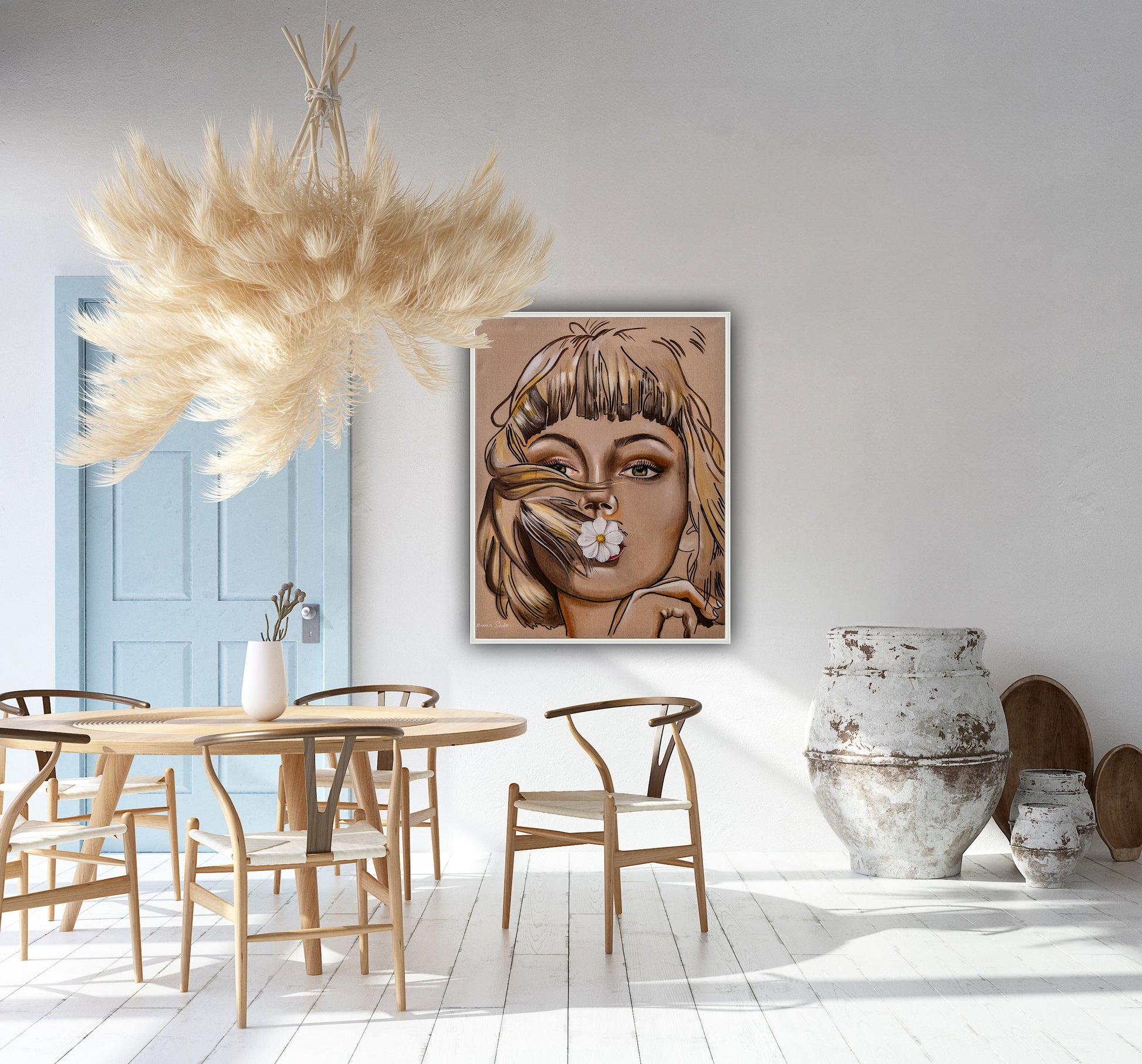 A soft and intimate portrait of a young girl with golden hair and striking green eyes. A single white flower rests gently between her lips, while strands of hair sweep across her face in a playful motion. The neutral tones and delicate lines give the piece a sense of calm mystery, expressing quiet emotion, natural beauty, and a gentle connection to nature.
