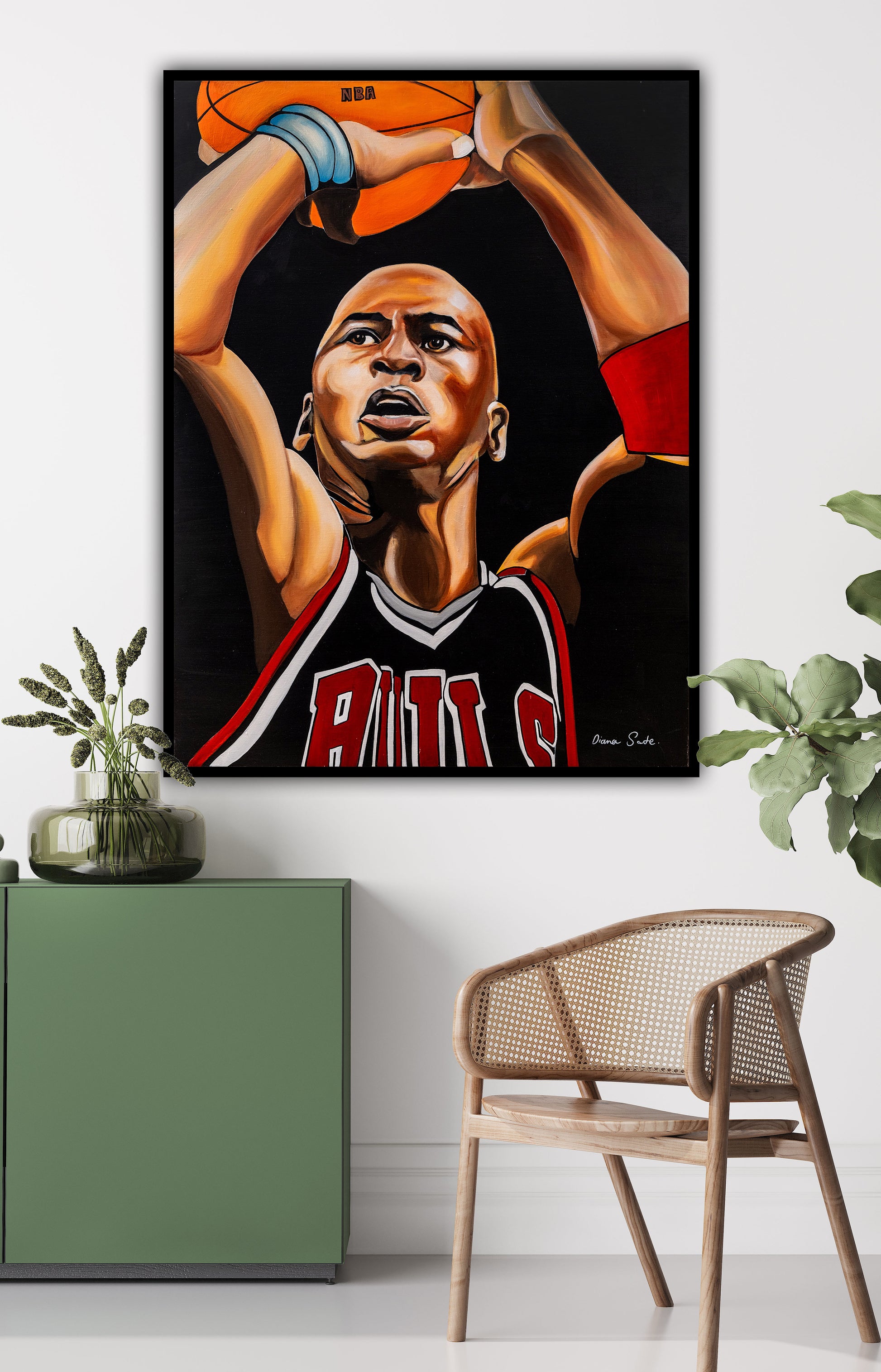 A portrait of basketball legend Michael Jordan in action, photographed mid-jump while wearing his iconic Chicago Bulls jersey. Full of determination, excellence, and eternal energy, Michael is one of the greatest athletes of all time.