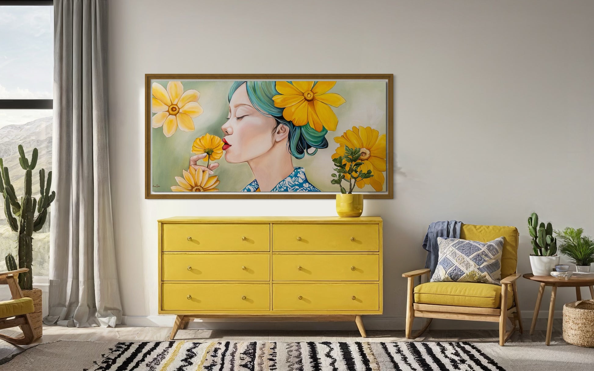 Size matters! Artwork has presence and affects the atmosphere in a space. The size of the artwork is significant, and its size does matter when it comes to visual impact. If the space is large, it’s recommended to choose a painting in a suitable size that won’t disappear within the room. You can consider combining two paintings or creating a wall collage. Pay attention to what you love about the size of the artwork and how it complements the room’s overall design and visual appeal.