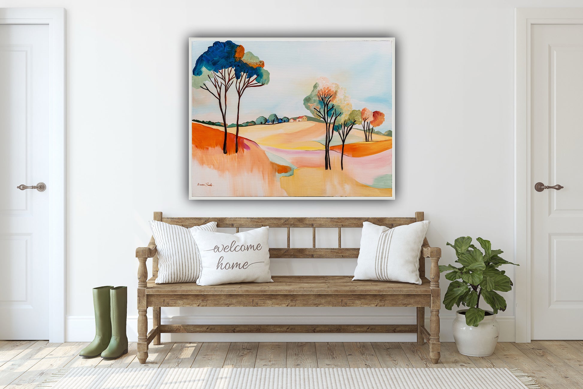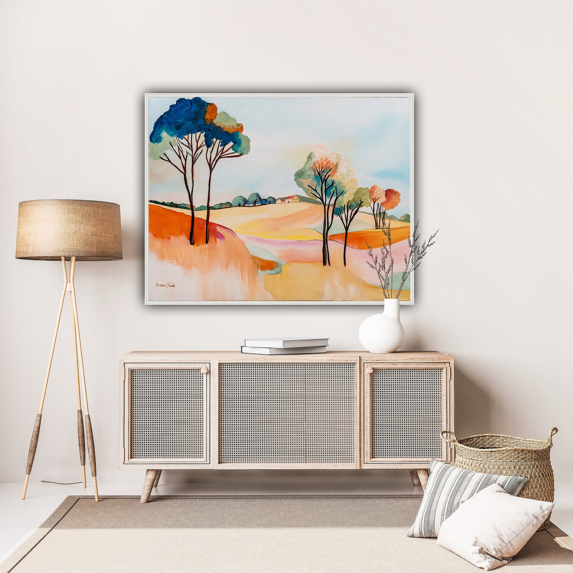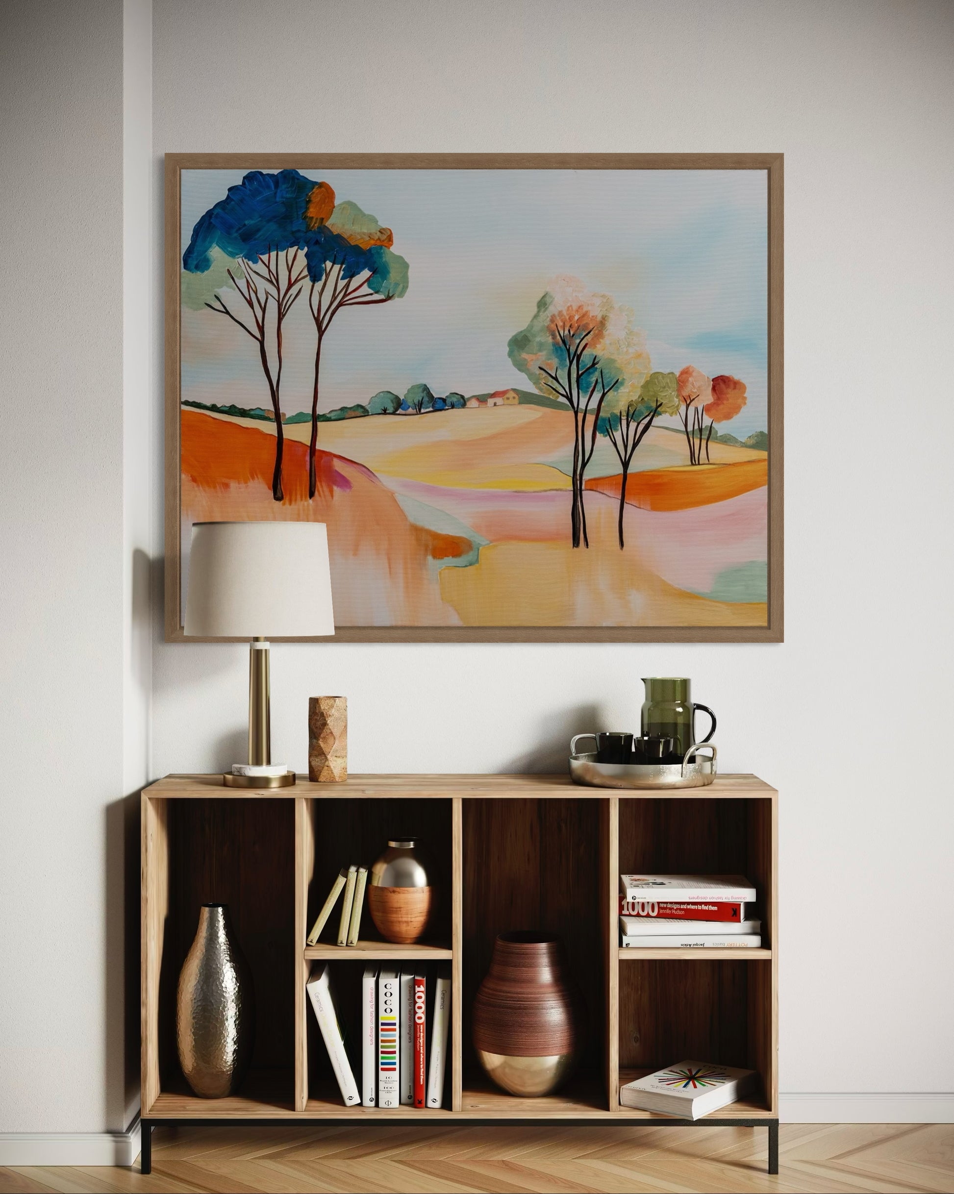 Match the colors in the painting to the living room/bedroom/dining room/office or any other space. Take into account the colors of the walls, furniture, curtains, and even the flooring. It’s essential that one of the colors in the painting or print matches or complements the other colors in the space. This ensures a more harmonious visual appearance in the room.
