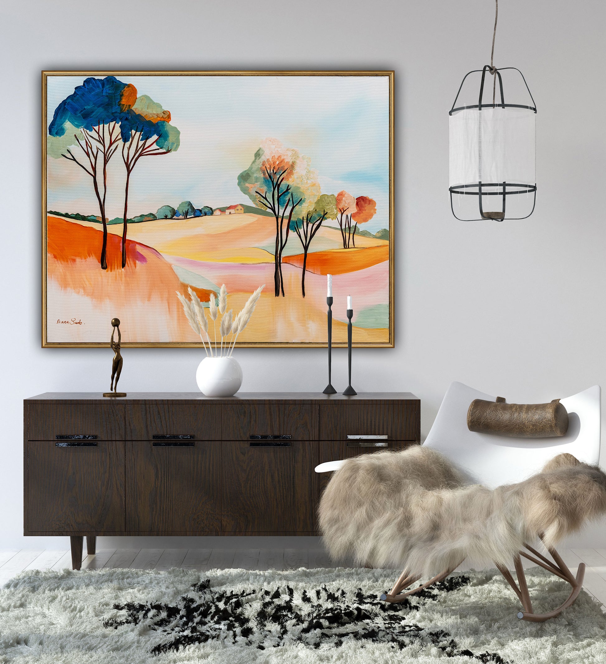 Size matters! Artwork has presence and affects the atmosphere in a space. The size of the artwork is significant, and its size does matter when it comes to visual impact. If the space is large, it’s recommended to choose a painting in a suitable size that won’t disappear within the room. You can consider combining two paintings or creating a wall collage. Pay attention to what you love about the size of the artwork and how it complements the room’s overall design and visual appeal.