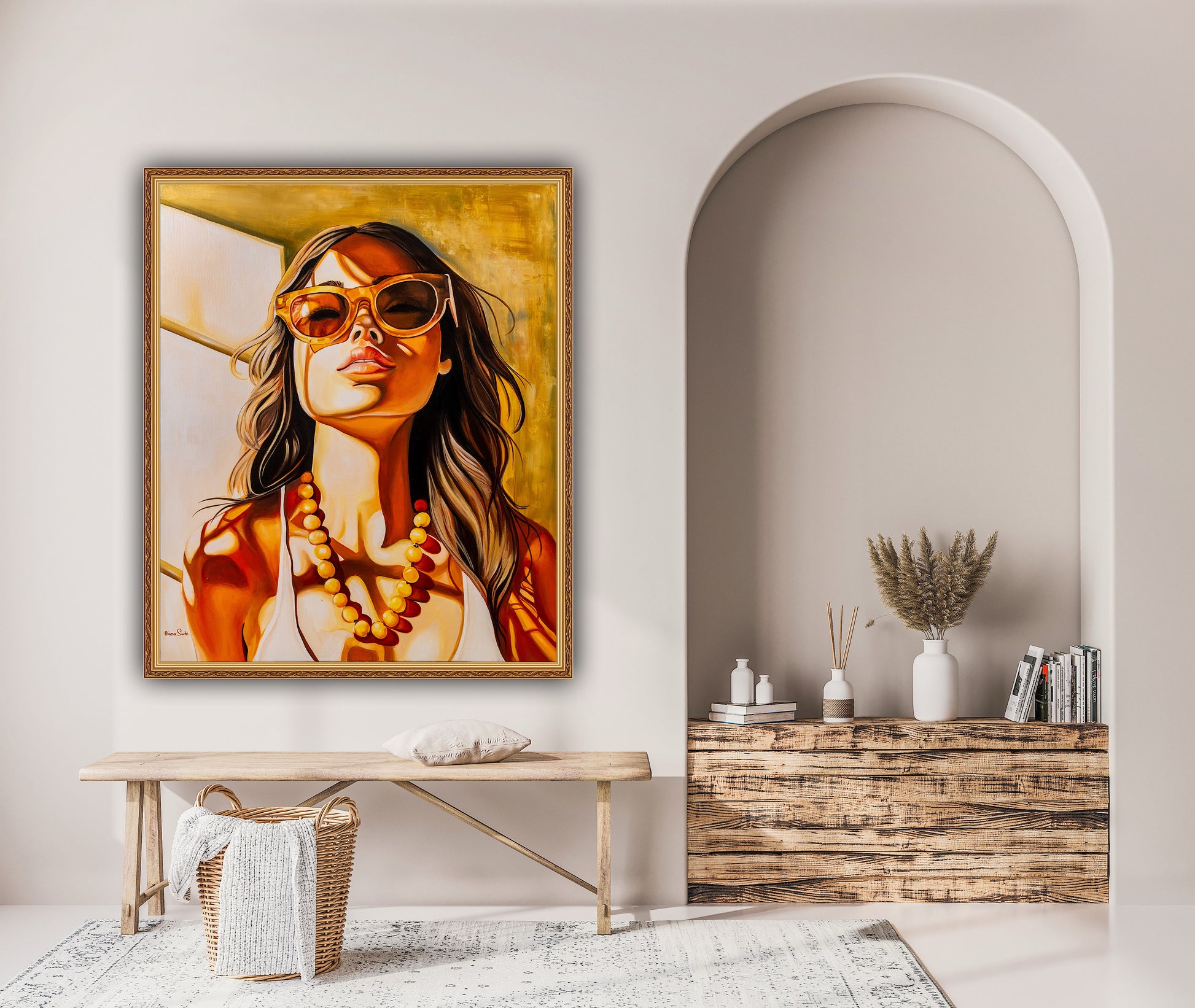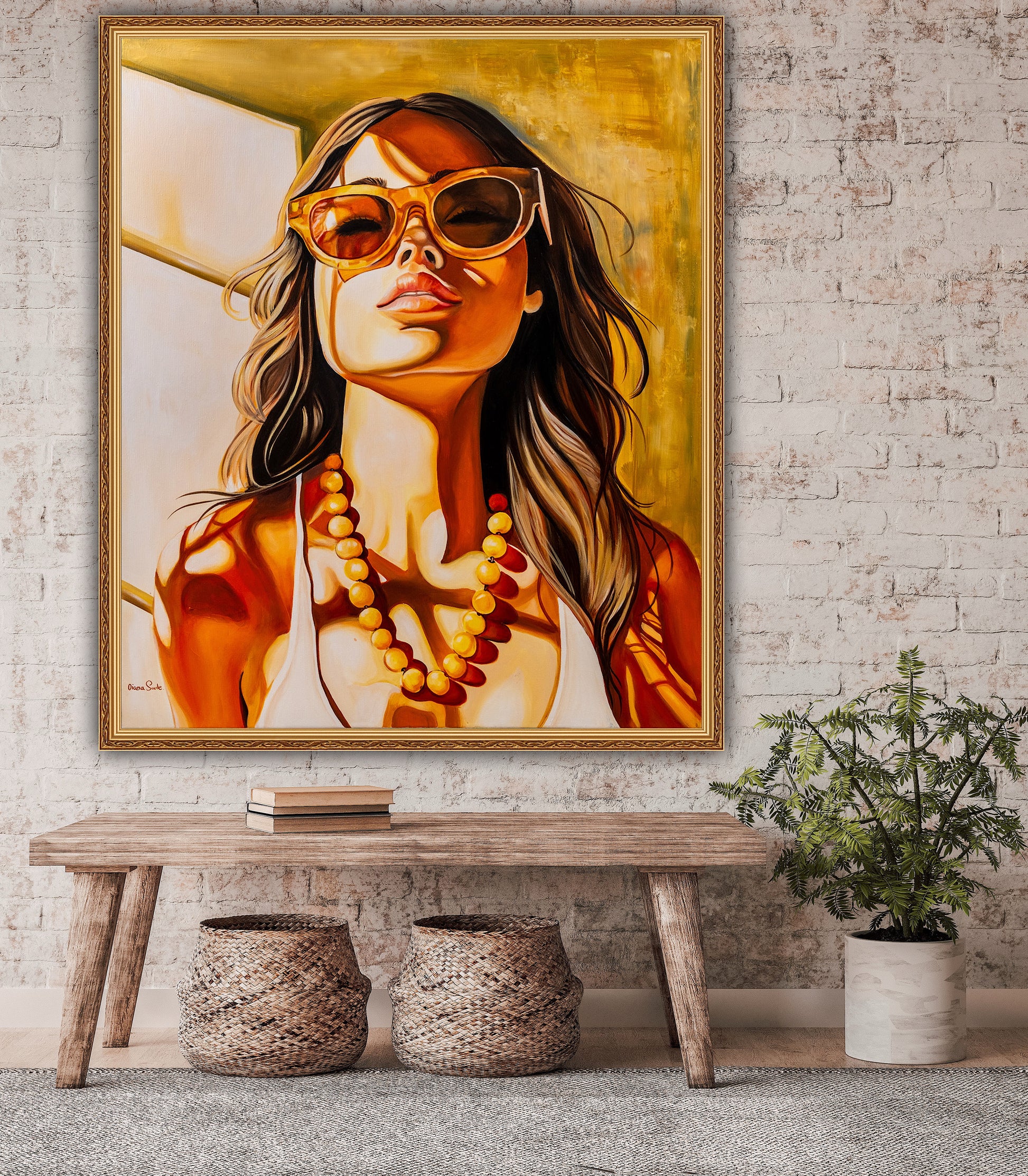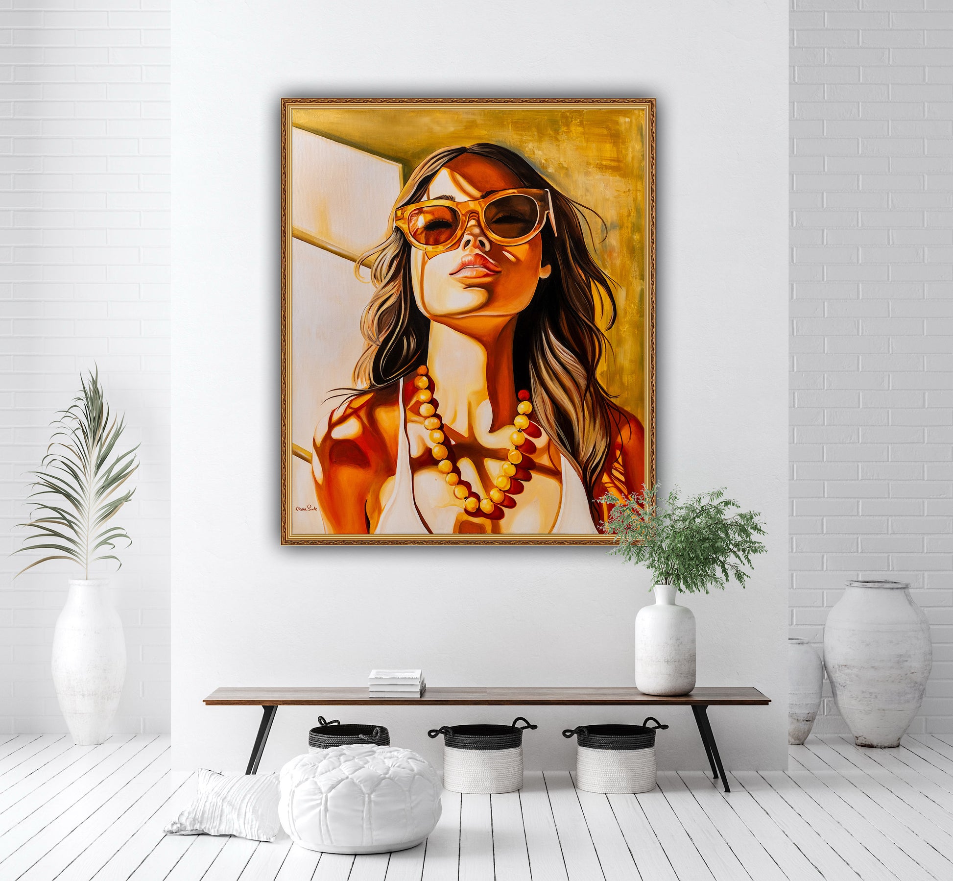 Flowing hair and a necklace of bold yellow-red beads, she stands confidently, eyes closed and head tilted slightly upwards. The rich amber tones and dramatic shadows convey a sense of serenity, power and absolute presence - capturing a moment of inner freedom and blissful silence.