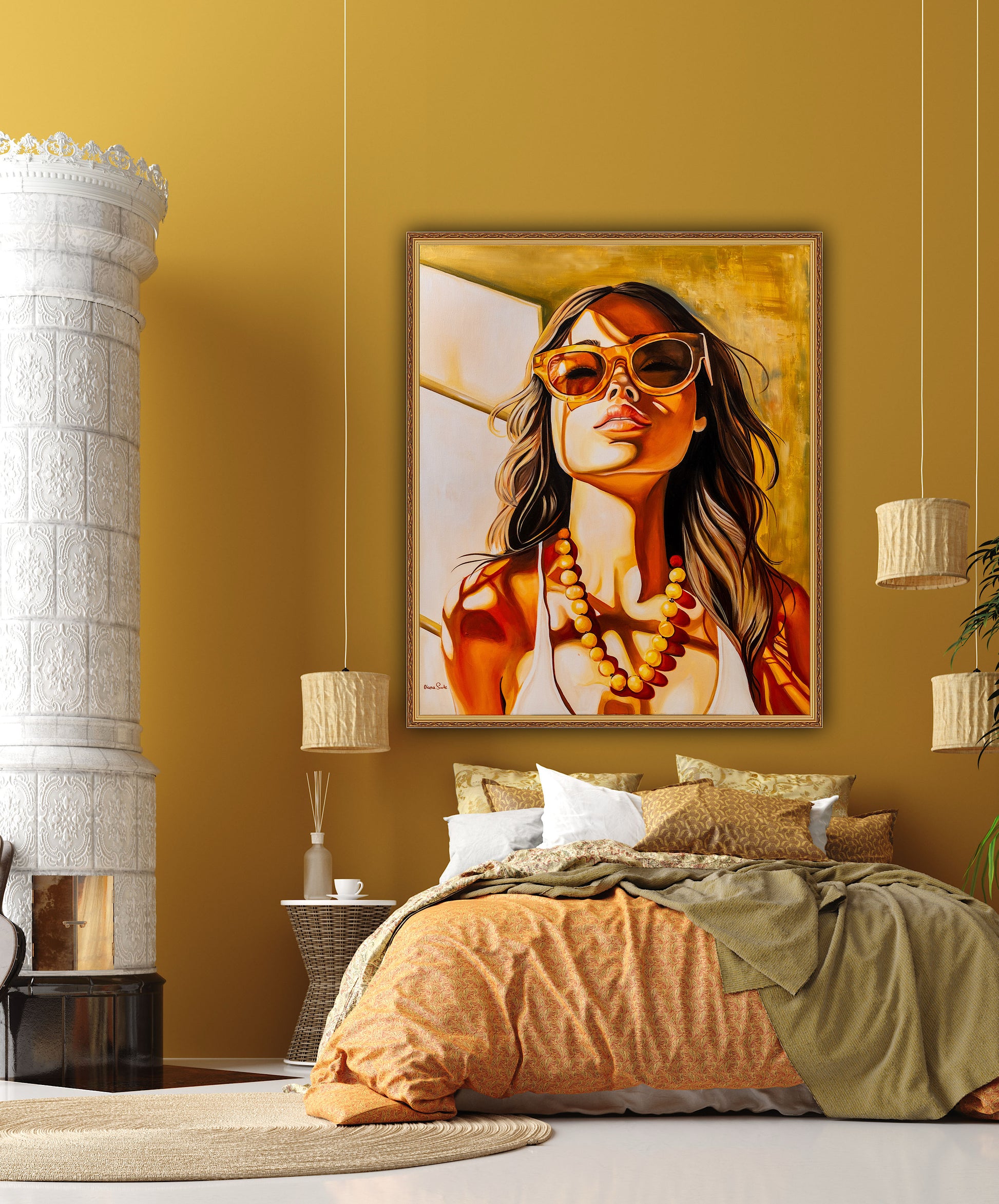 Size matters! Artwork has presence and affects the atmosphere in a space. The size of the artwork is significant, and its size does matter when it comes to visual impact. If the space is large, it’s recommended to choose a painting in a suitable size that won’t disappear within the room. You can consider combining two paintings or creating a wall collage. Pay attention to what you love about the size of the artwork and how it complements the room’s overall design and visual appeal.