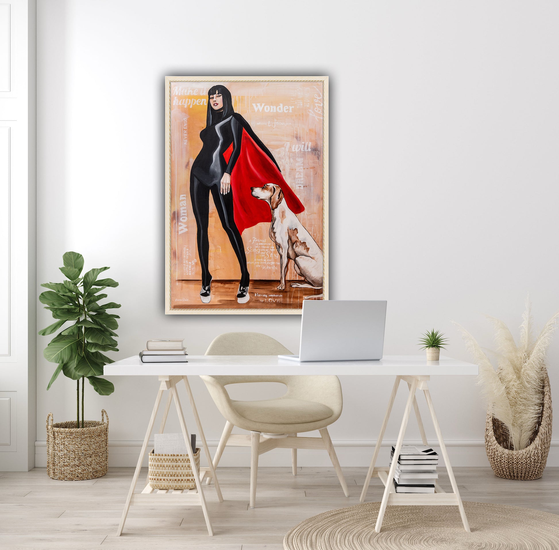 A powerful work that deals with female identity and power. The central character, a strong woman dressed as a superhero, stands confidently and elegantly, wrapped in a red cape – a symbol of determination and confidence. The dog by her side symbolizes the loyal friend who is present both in quiet and stormy times. The background of the work includes inspiring words such as "Wonder", "Make it happen", and "I will" – combining a personal and global message of hope, courage and taking responsibility.