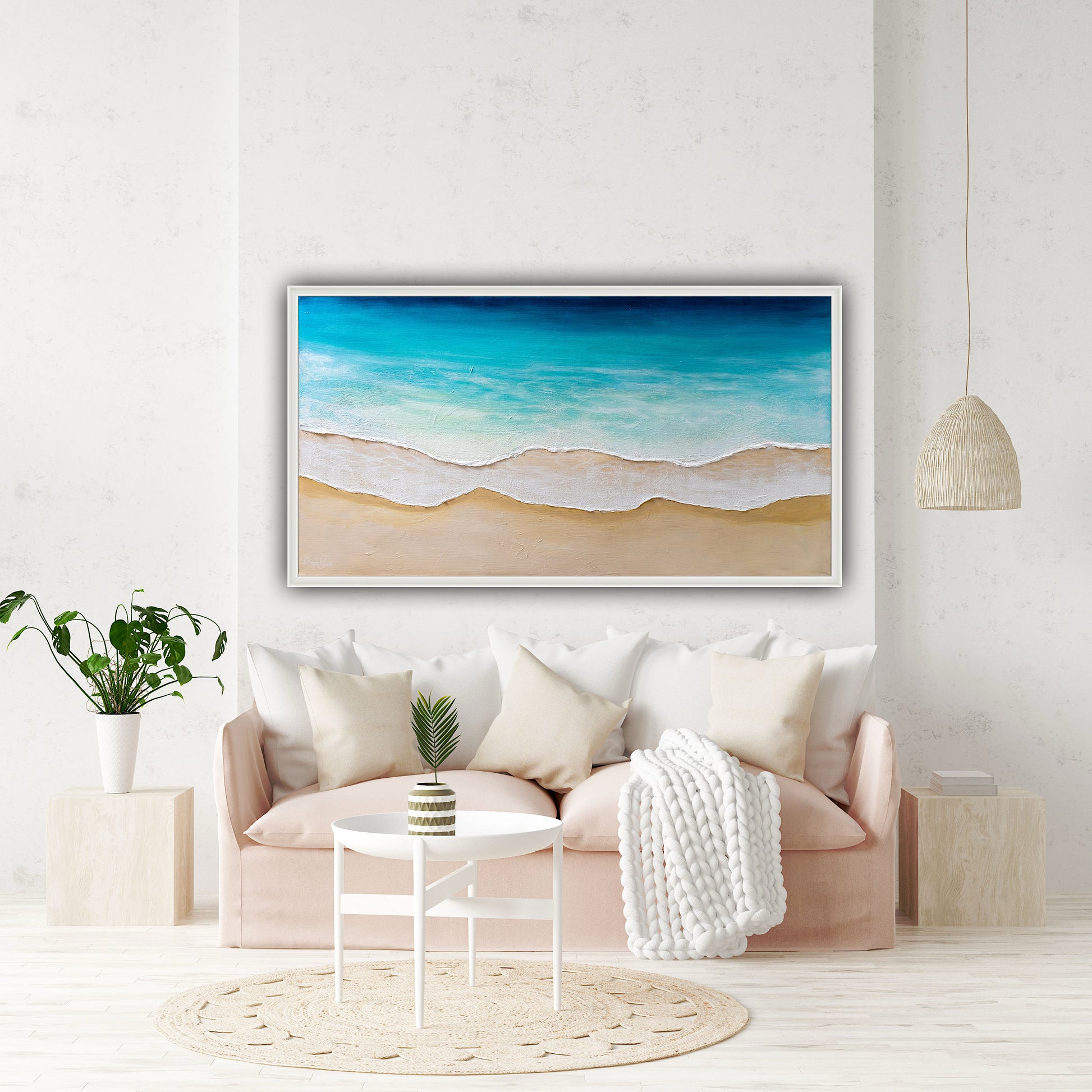 Size matters! Artwork has presence and affects the atmosphere in a space. The size of the artwork is significant, and its size does matter when it comes to visual impact. If the space is large, it’s recommended to choose a painting in a suitable size that won’t disappear within the room. You can consider combining two paintings or creating a wall collage. Pay attention to what you love about the size of the artwork and how it complements the room’s overall design and visual appeal.