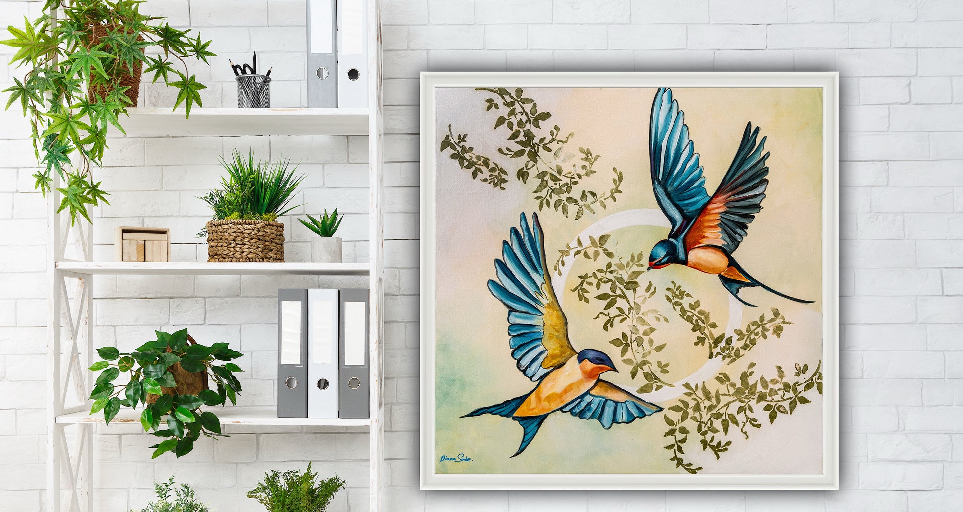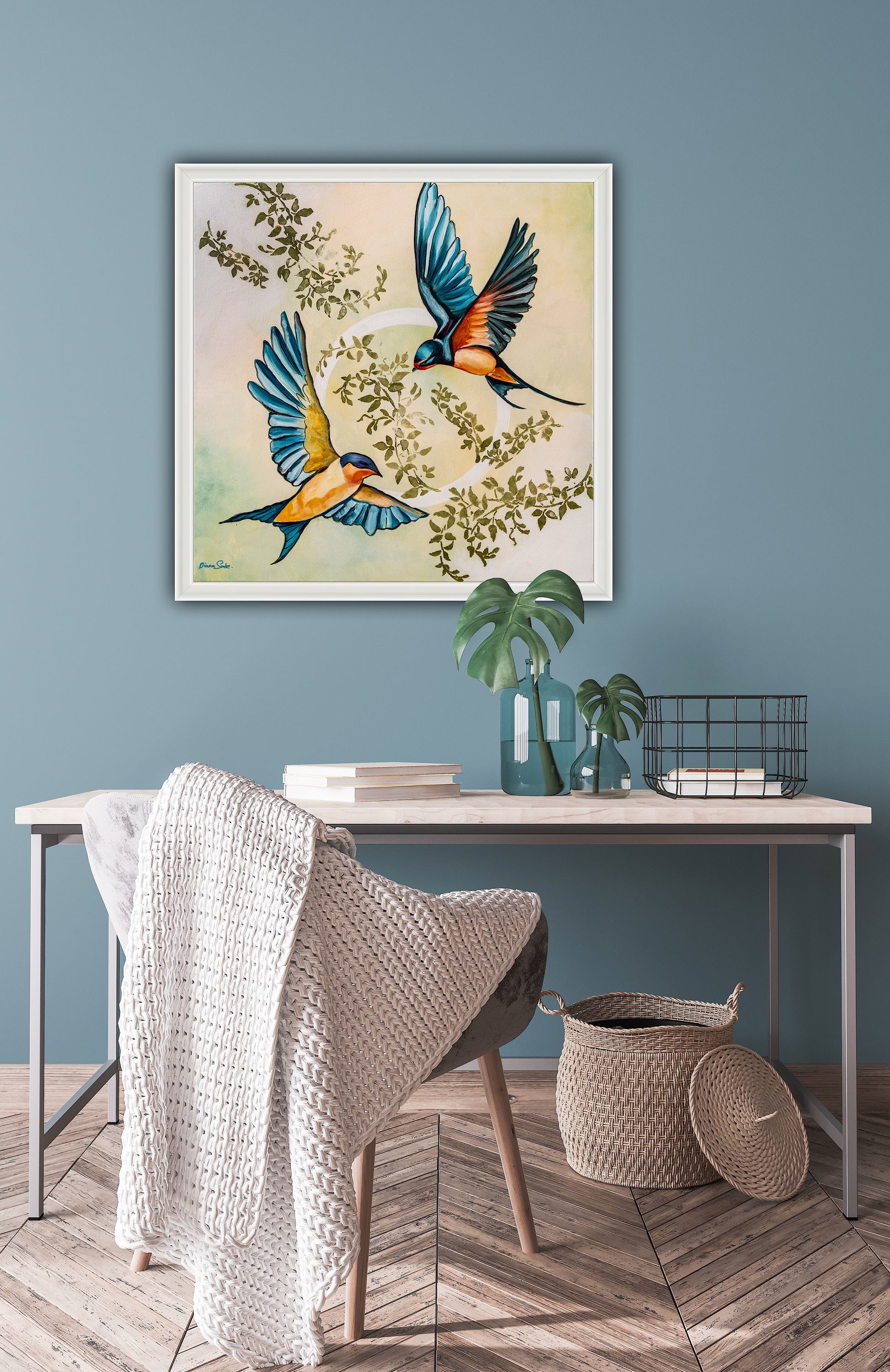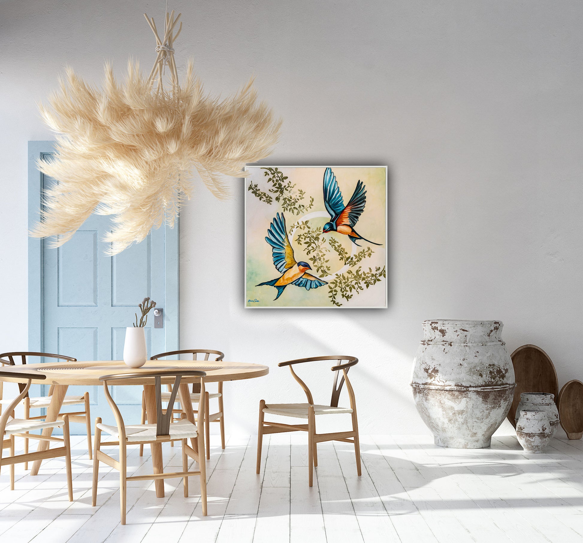 Two colorful birds, painted in dynamic strokes of blue and orange, dance in the air against a soft pastel sky. Green leaves decorate their courtship flight, capturing a moment of perfect symmetry, freedom and connection with nature. A celebration of movement and tranquility.