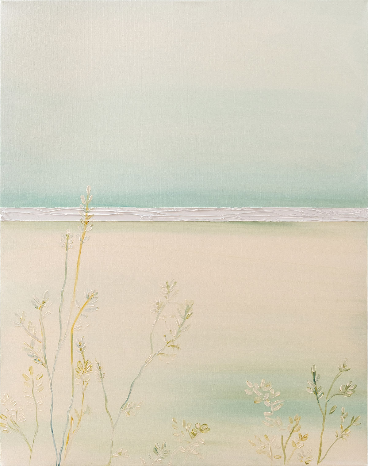 A soothing minimalist landscape pair in soft pastel shades of green and beige. The diptych offers a peaceful view of distant horizons, with delicate stems on the left and a prominently textured coastline, perfect for serene, modern spaces.