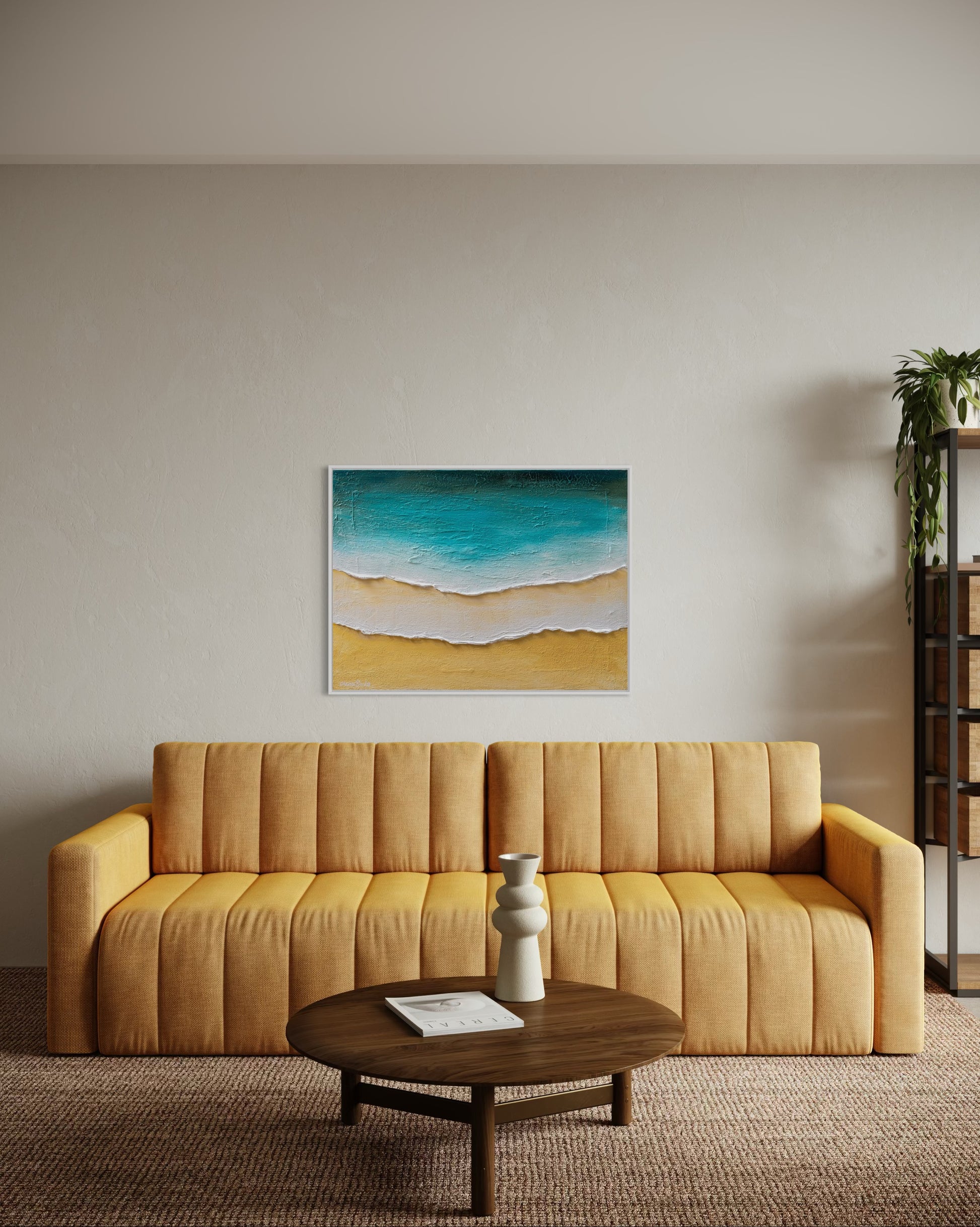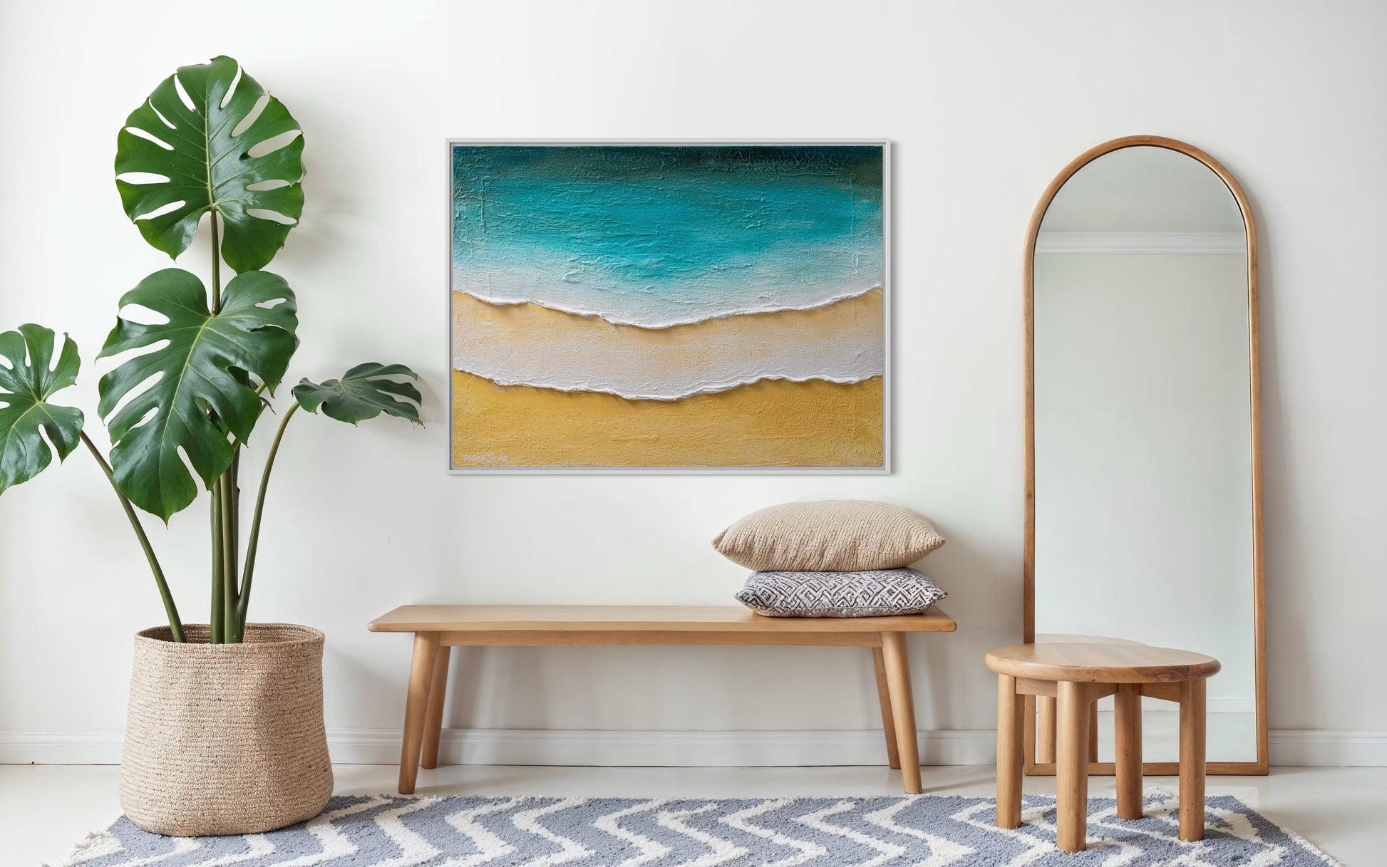 A seascape with multi-layered brushstrokes that give a sense of movement and depth, a painting that inspires a sense of peace, suitable for any space