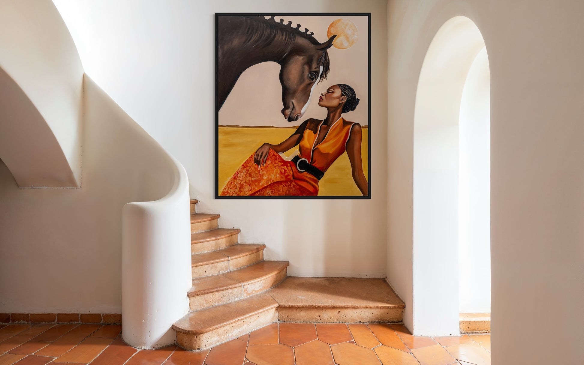 A soulful scene capturing a serene connection between a woman and a horse under the warm glow of a golden sun. The woman, dressed in a flowing orange and red garment with floral details, gazes peacefully at the majestic animal. Set against a vast, sunlit landscape, the painting radiates harmony, mutual respect, and the natural bond between human and animal.