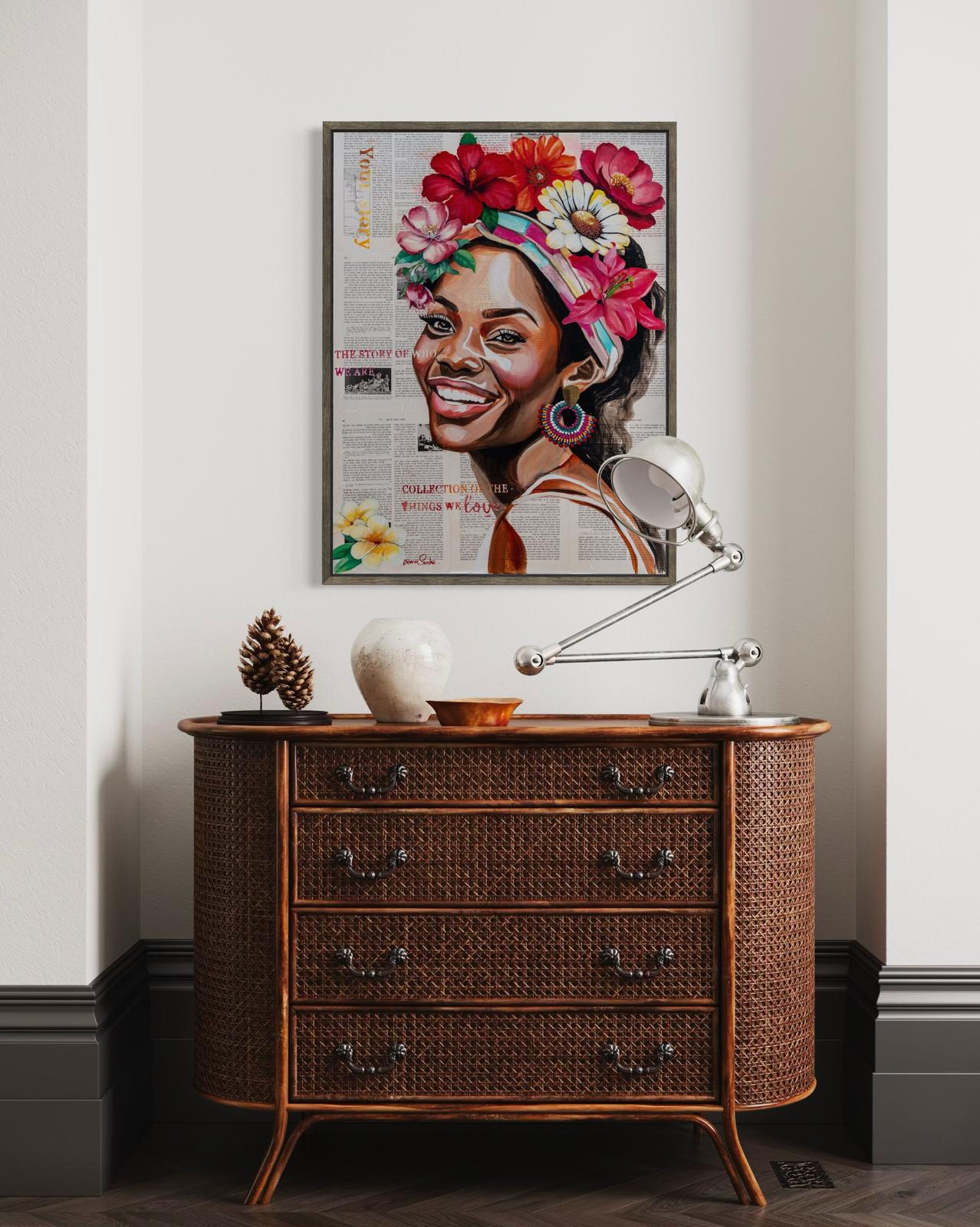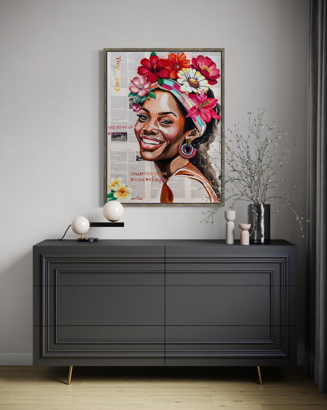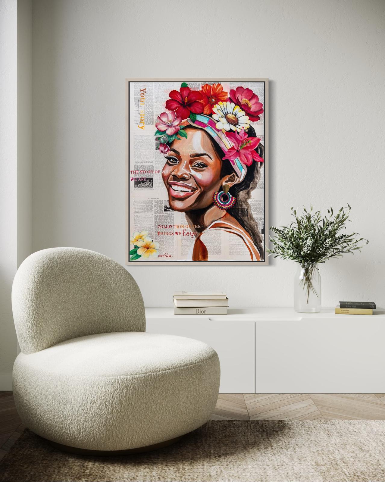 A vibrant and joyful painting portraying a radiant African woman adorned with flowers, expressing confidence, warmth, and vitality.
