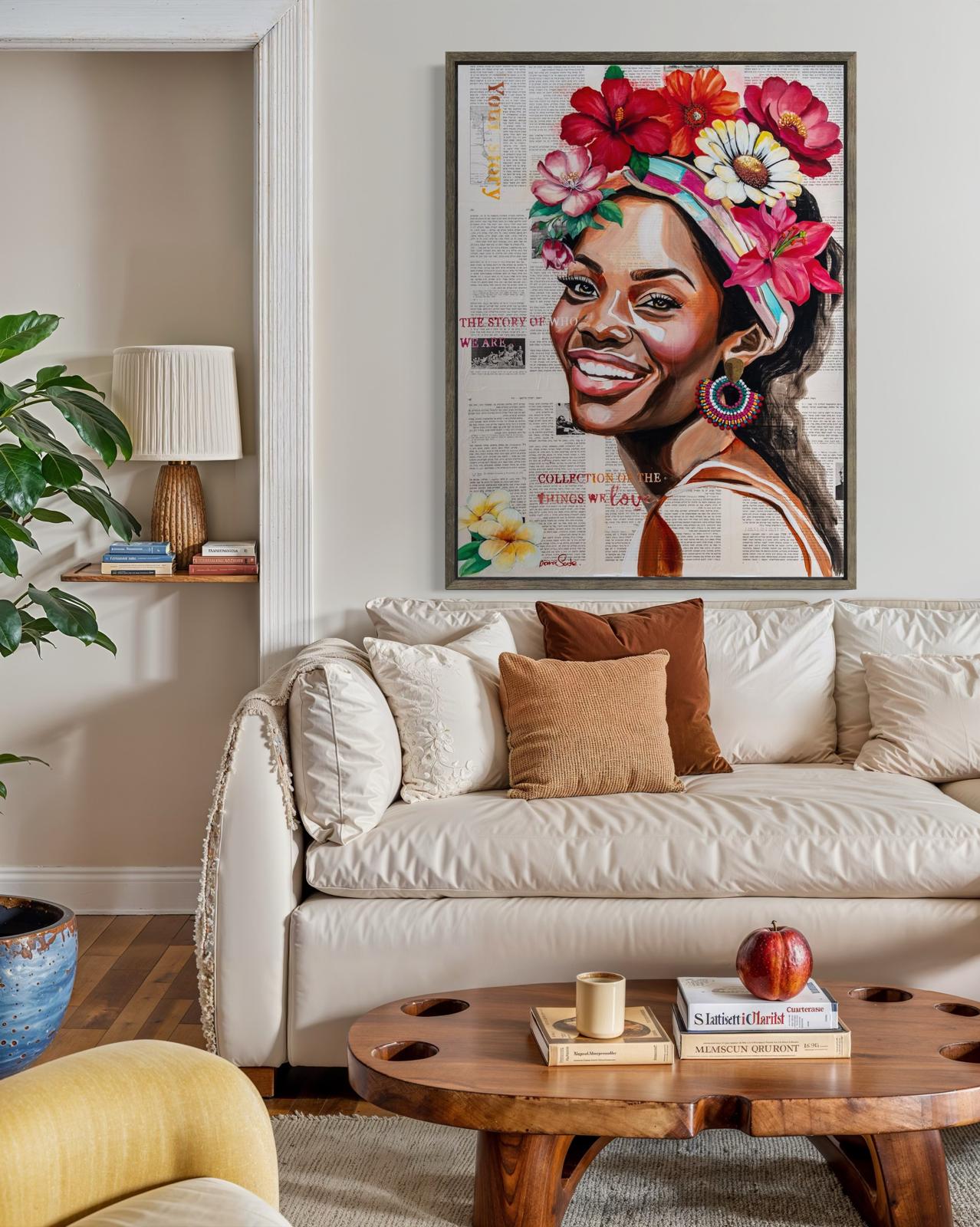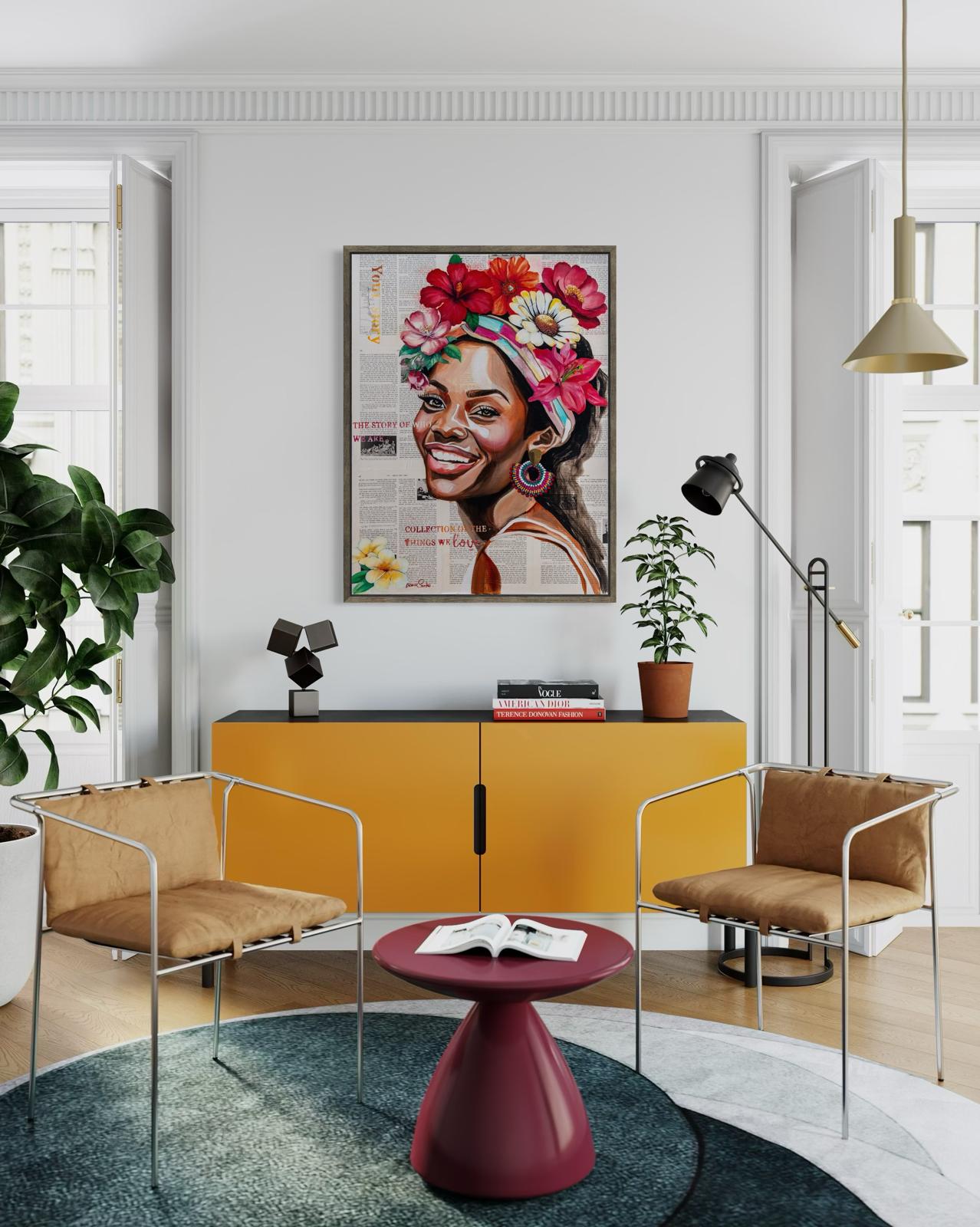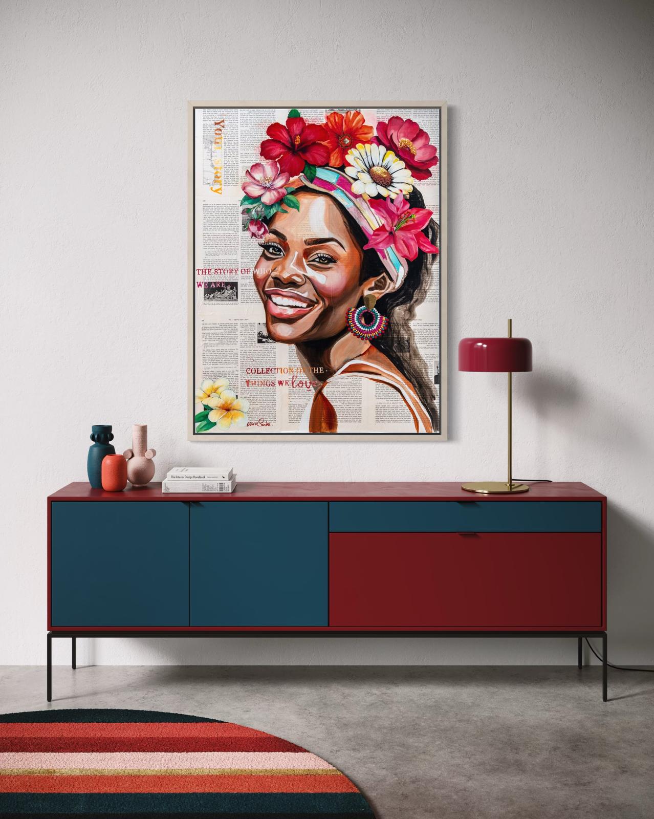 A vibrant and joyful painting portraying a radiant African woman adorned with flowers, expressing confidence, warmth, and vitality.