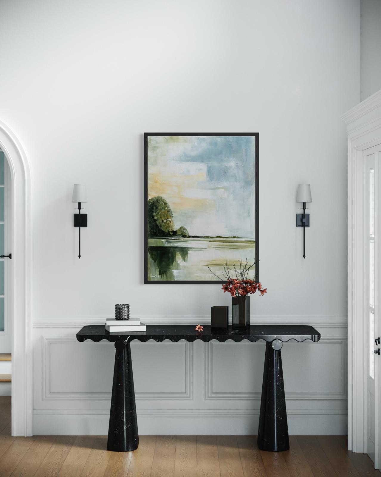 In large spaces, a single large painting or a series of works may be the right choice, while in smaller spaces a delicate piece or a light pair will fit beautifully.