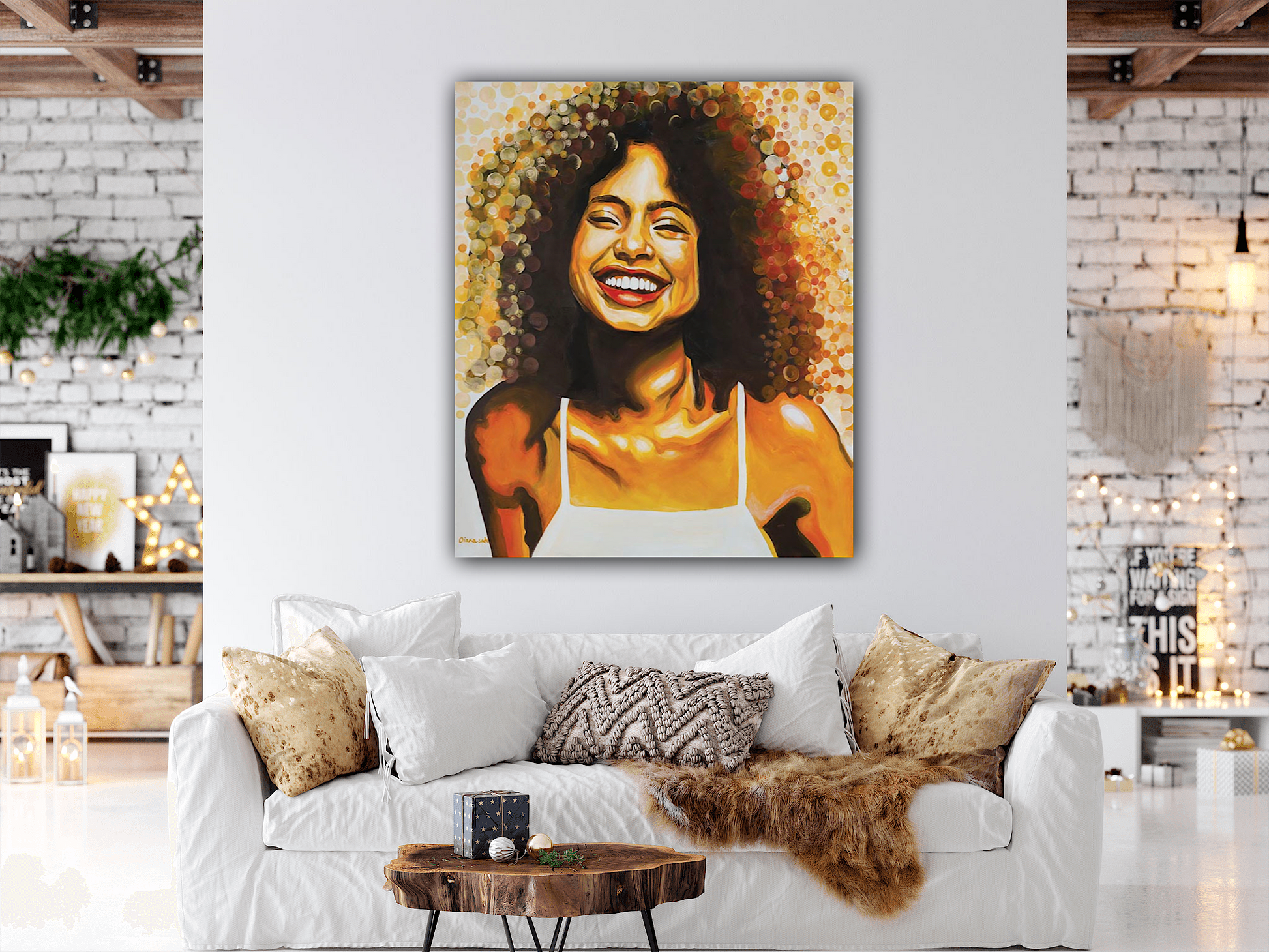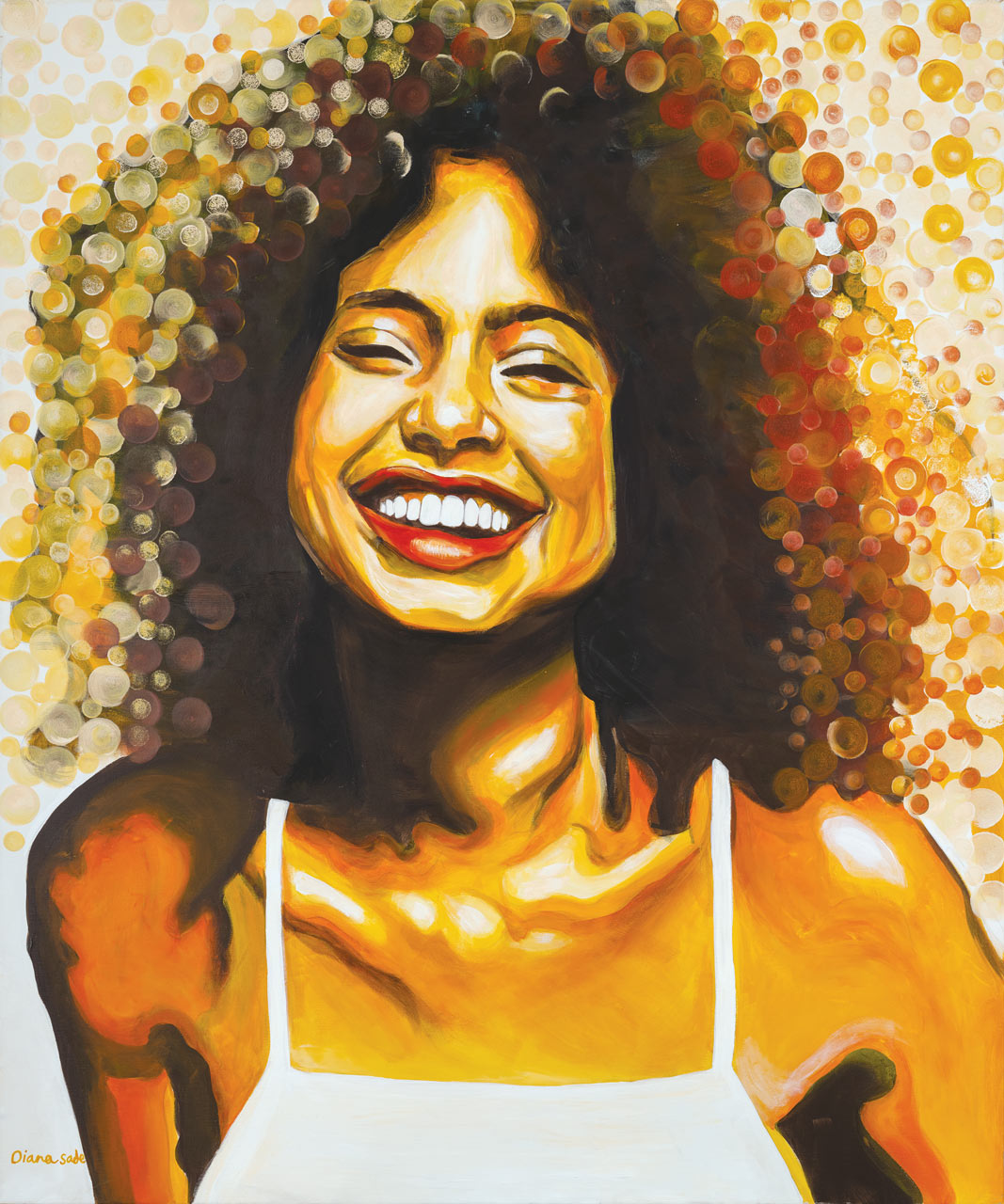 depicted in warm and emotive colors. She has a wide smile, and her eyes shine with joy and vitality.