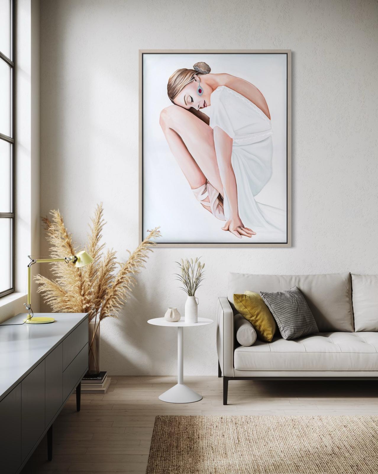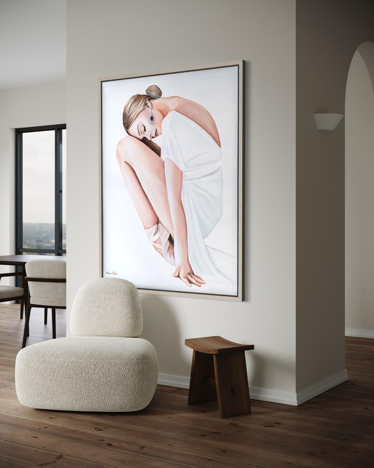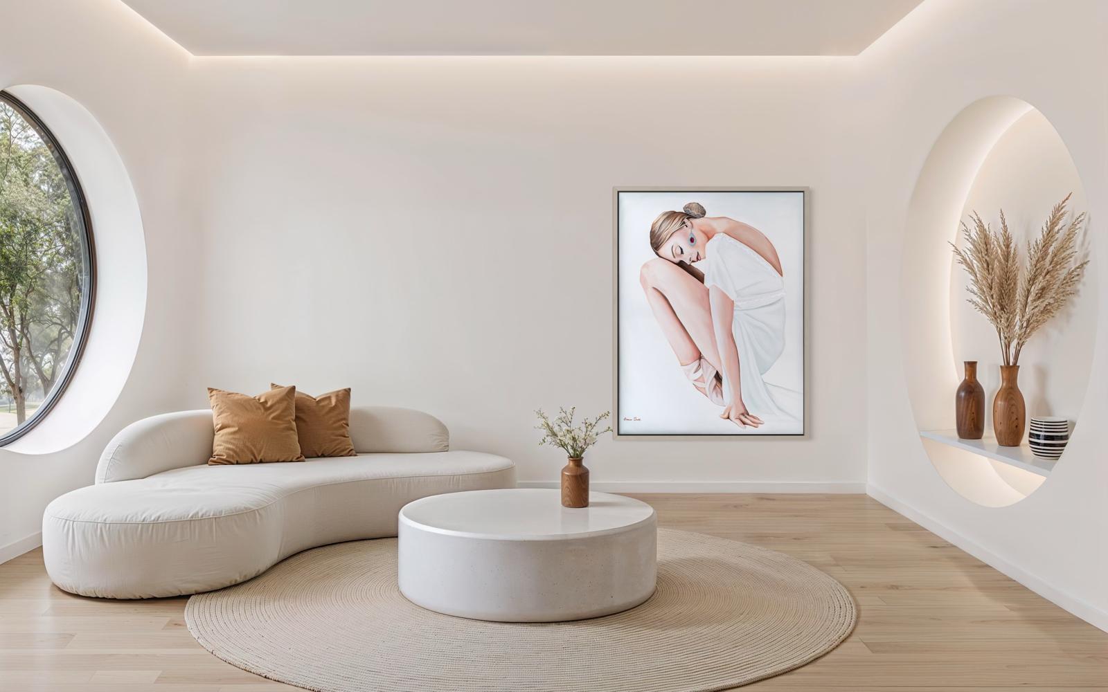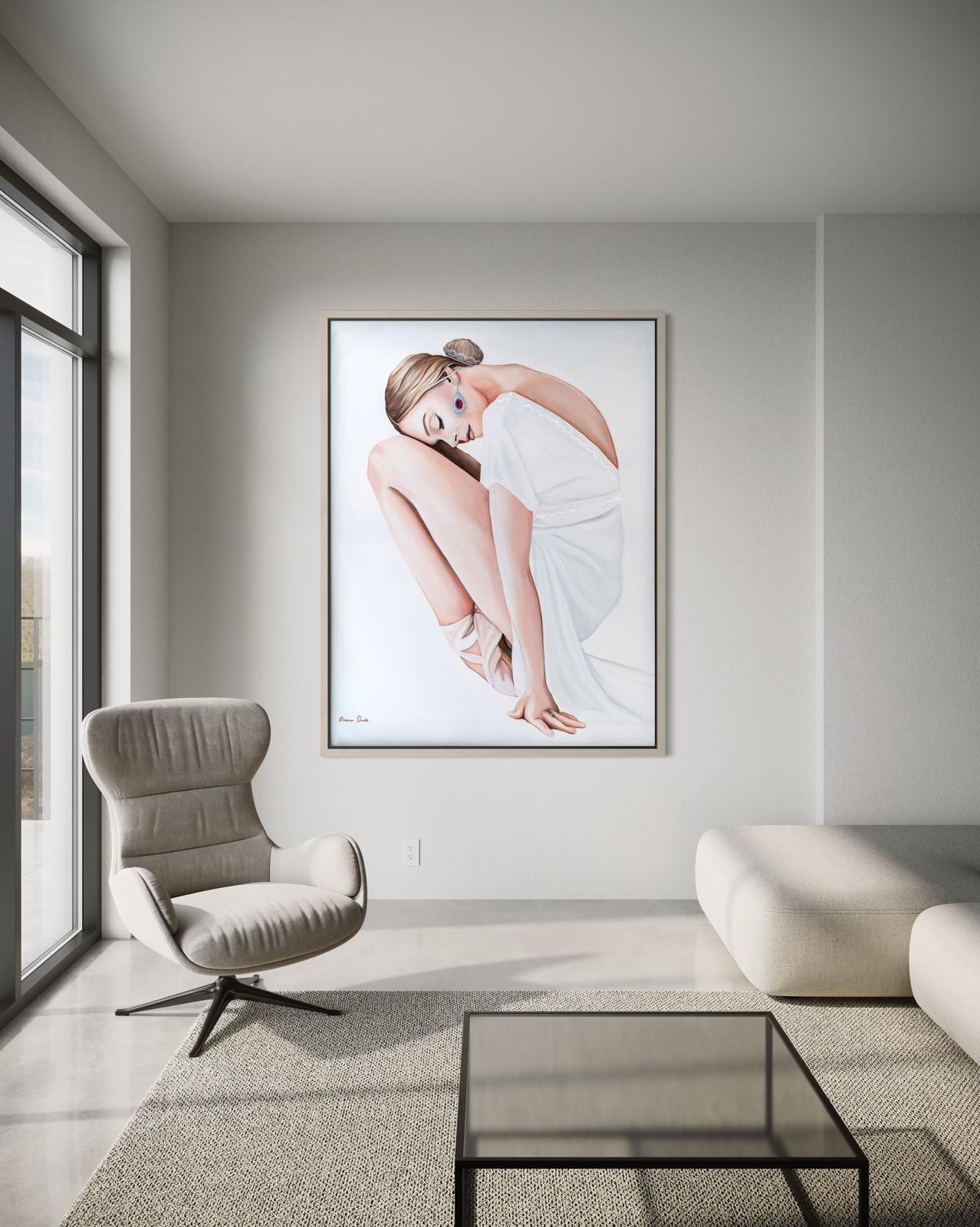 The soft white composition, elegant pose, and serene expression convey balance, purity, and feminine grace.