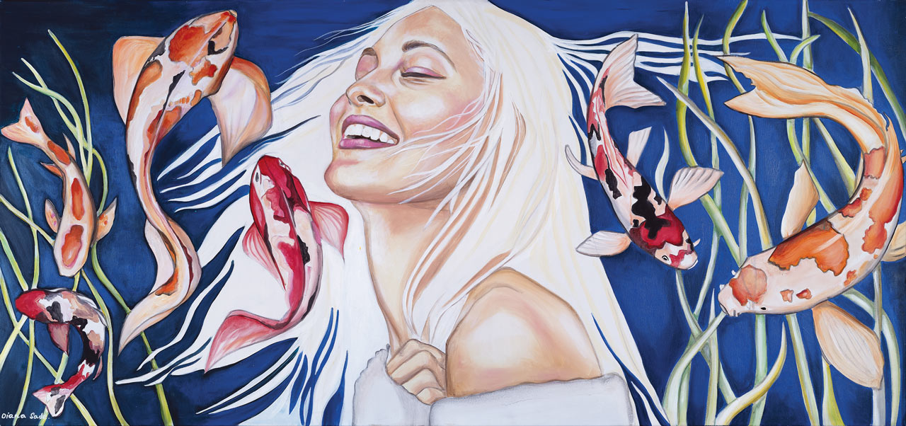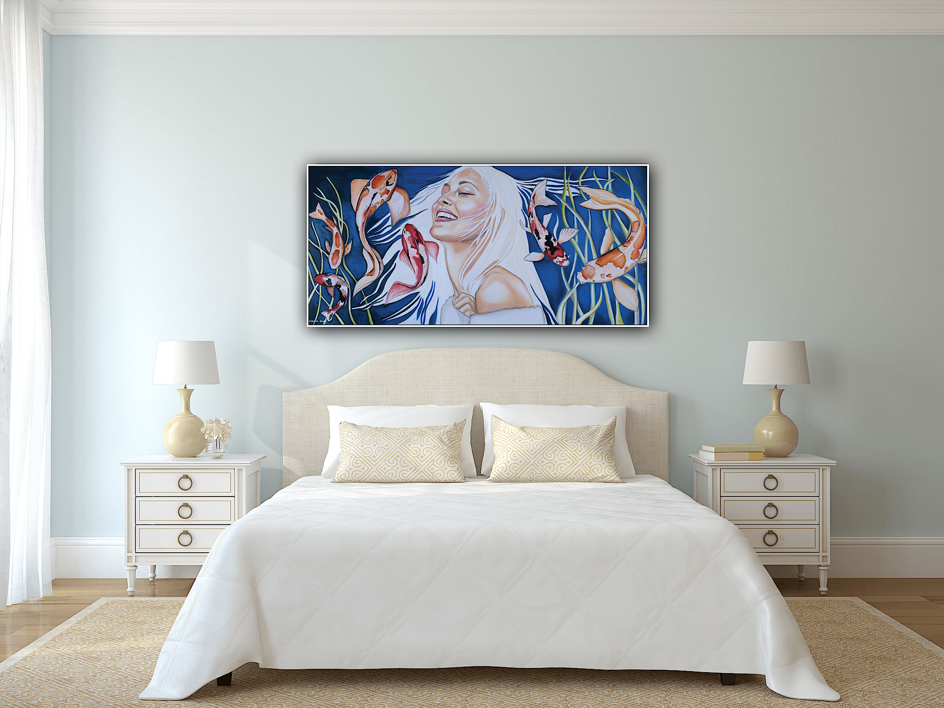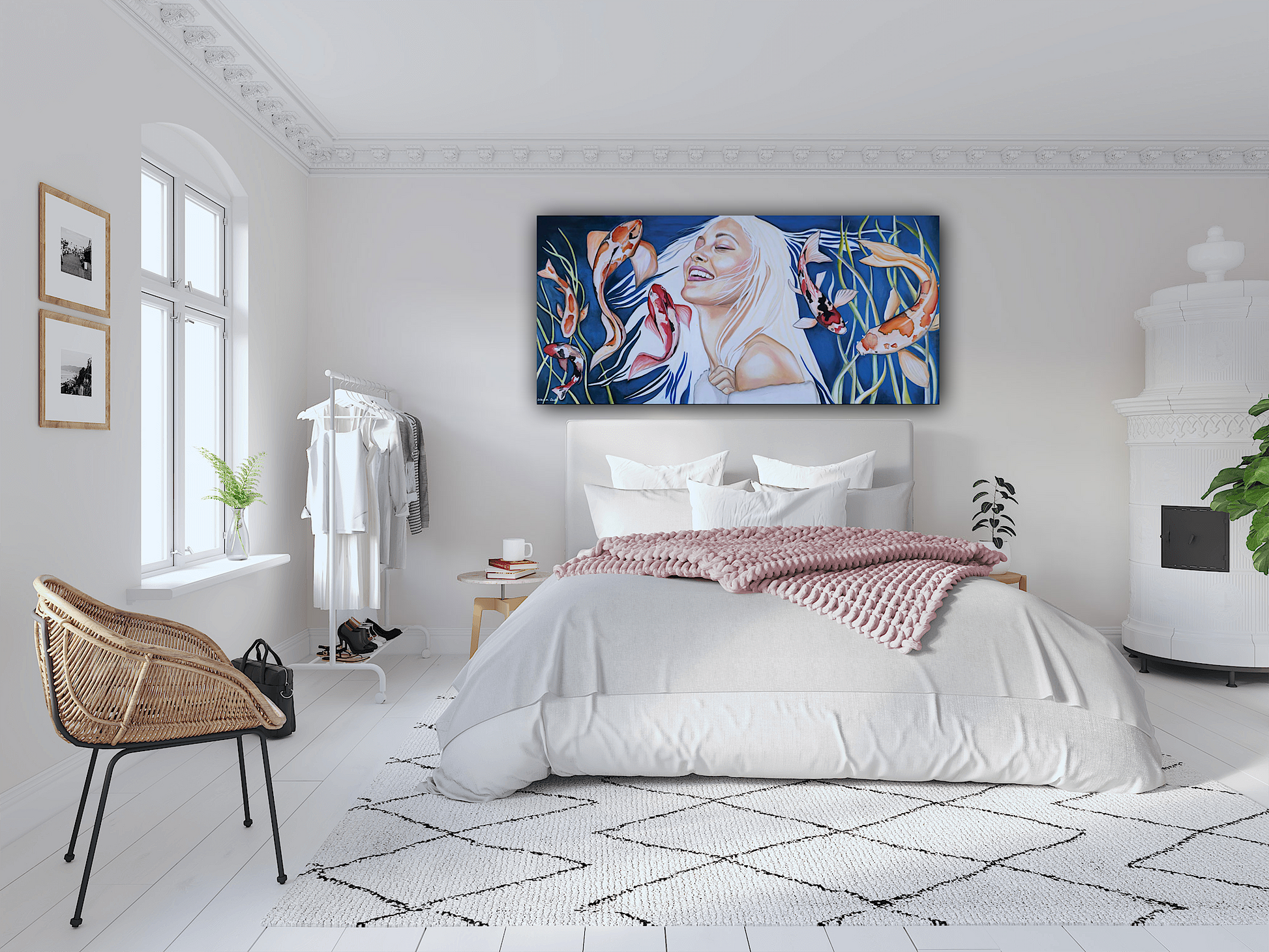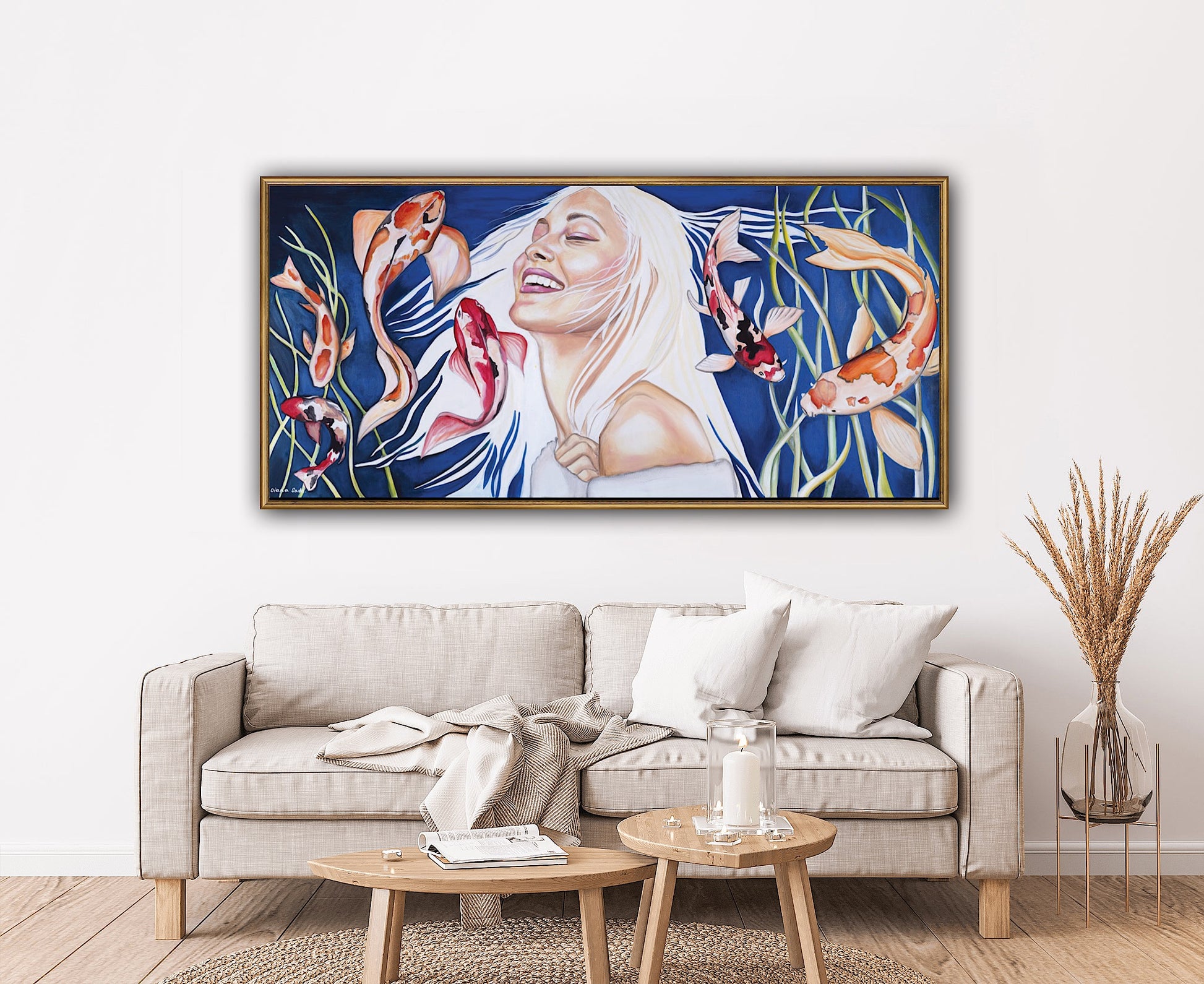 The figure in the painting is depicted as joyful and happy, surrounded by Japanese koi fish symbolizing good fortune.