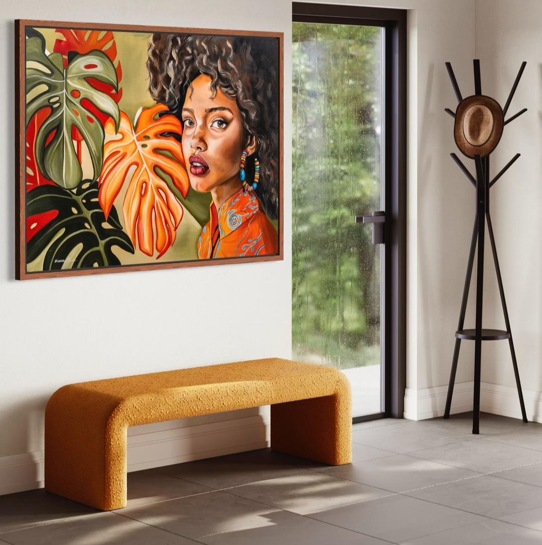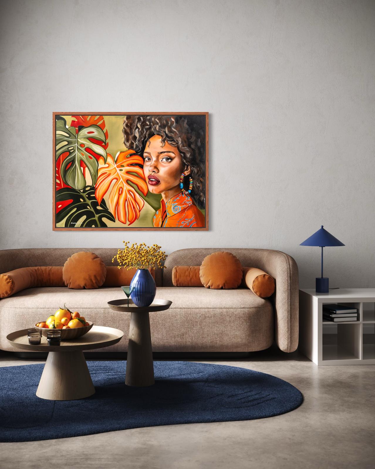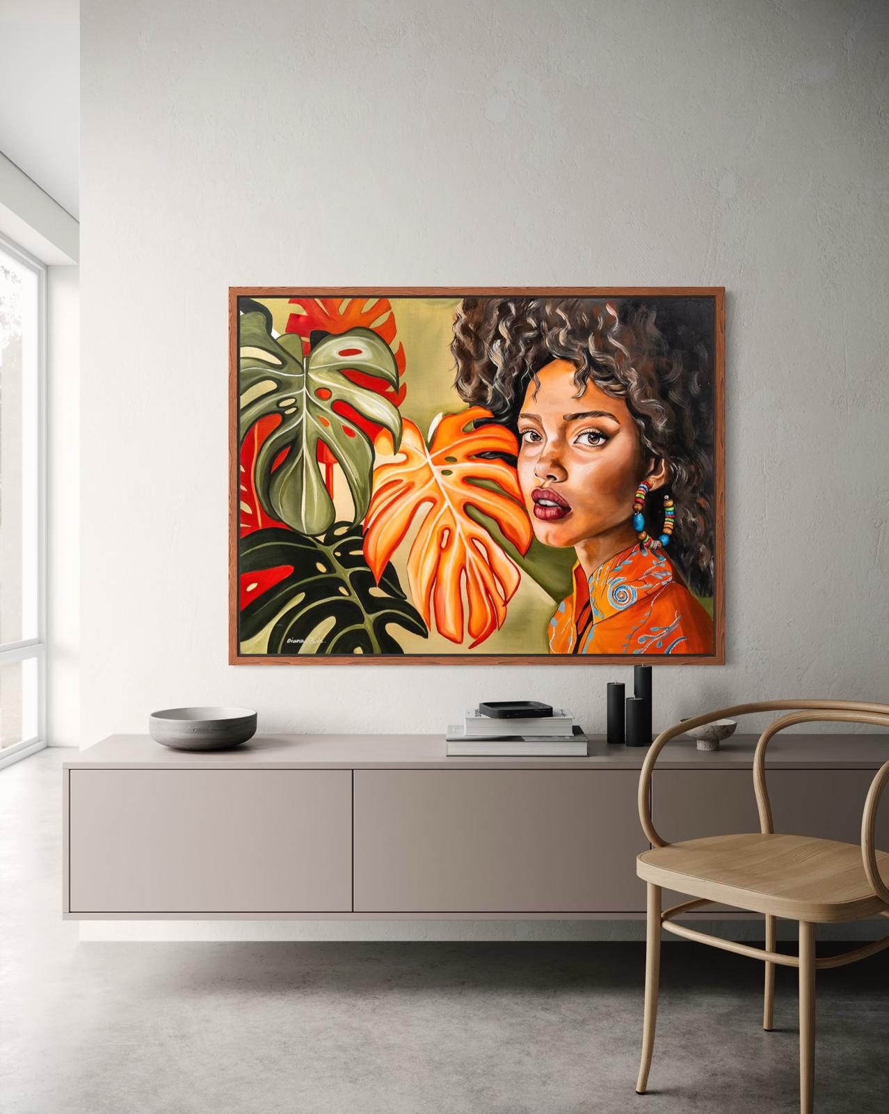 An African woman full of presence, her gaze penetrating and powerful, surrounded by large tropical leaves in shades of bright green and orange. The combination of the delicate skin and facial expression with the living nature around creates a feeling of a deep connection to the earth and roots. The colorful clothing and ethnic earrings add a cultural and festive layer, enhancing her image as a powerful and proud female figure. The painting expresses a connection between nature and man, between strong femininity and wild and authentic beauty.