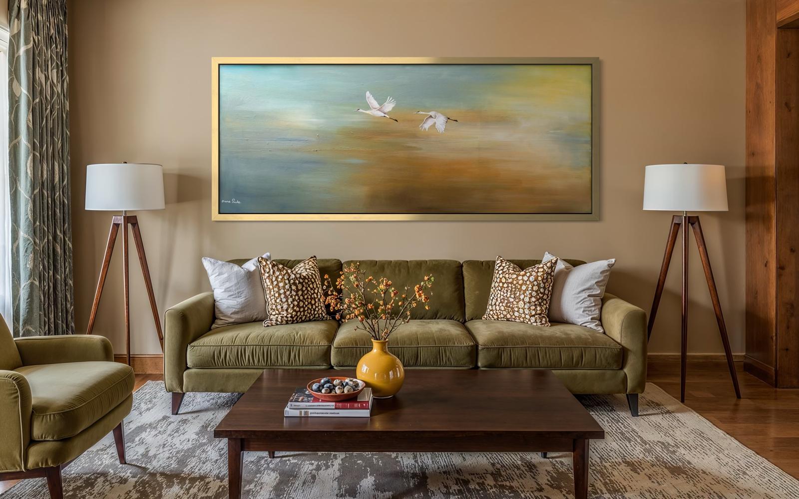 A serene horizontal composition, two white cranes fly over a dreamy landscape. Hazy shades of golden sand, soft turquoise and misty grey blend together to create a peaceful backdrop. The cranes symbolize grace, harmony and freedom - bringing a sense of quiet movement and elegance to the space.