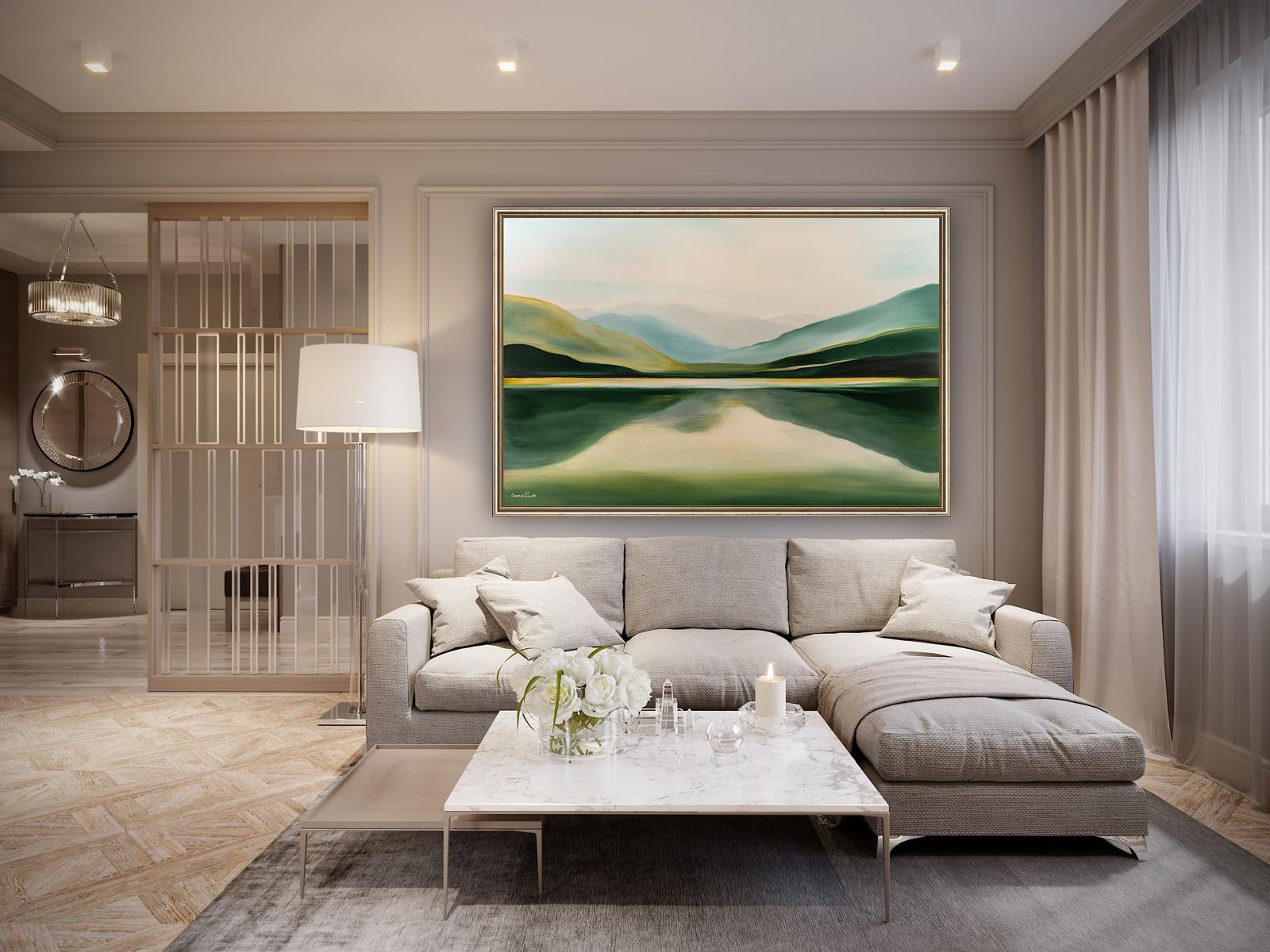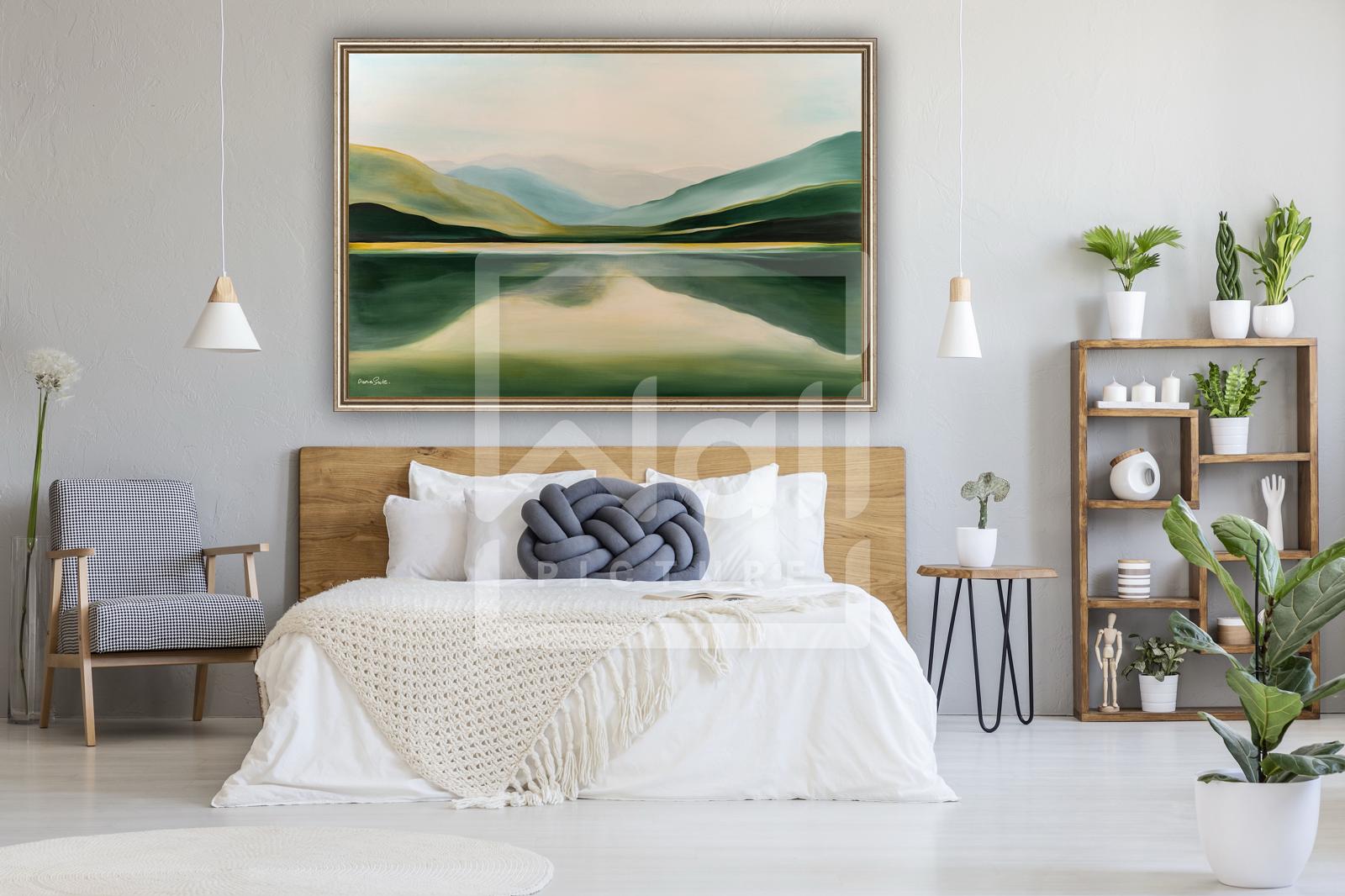 For a living room, a warm and deep painting may be most fitting; for a bedroom, something calm and serene; and for an office, a piece that inspires or brings quiet reflection.
