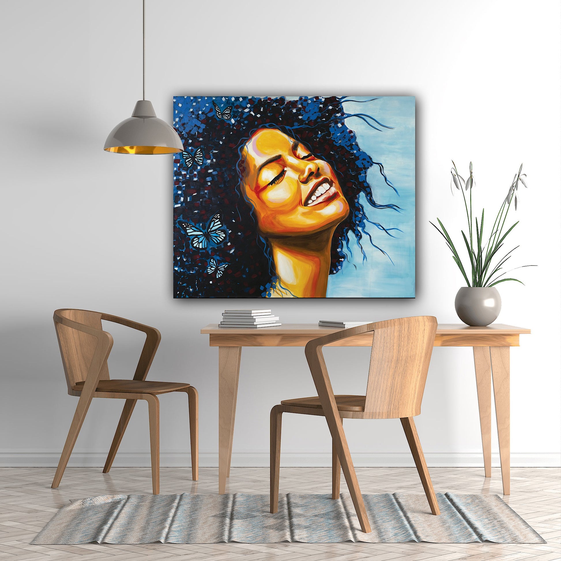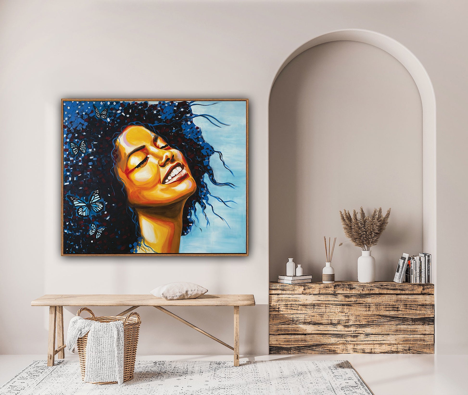 with butterflies in her hair, a painting full of happiness, freedom, and liberation.