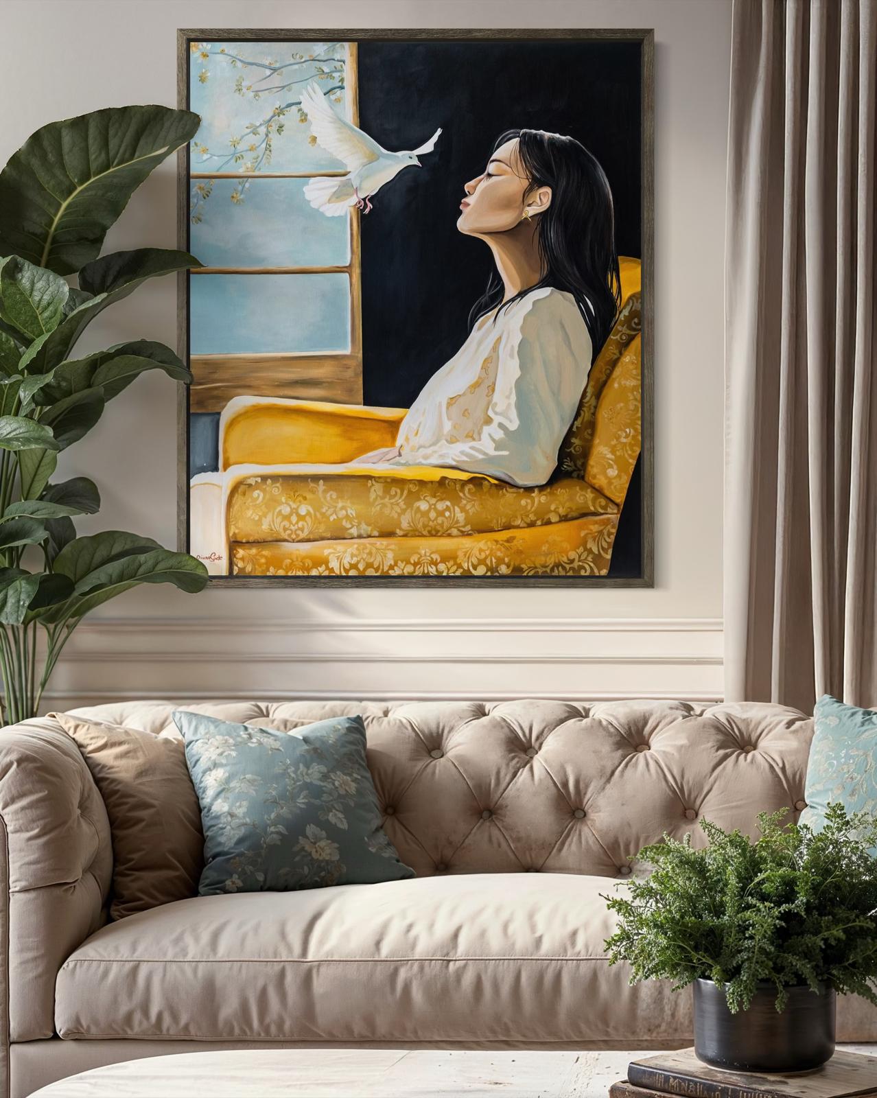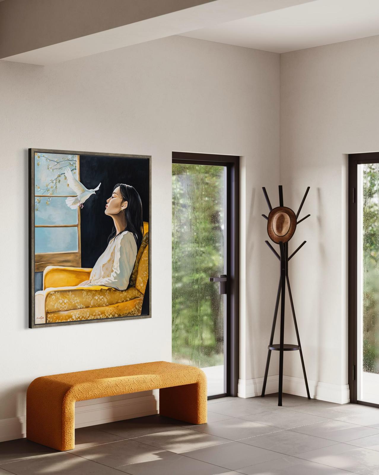 The encounter between the woman and the dove evokes calm, freedom, and a sense of new light entering the heart.