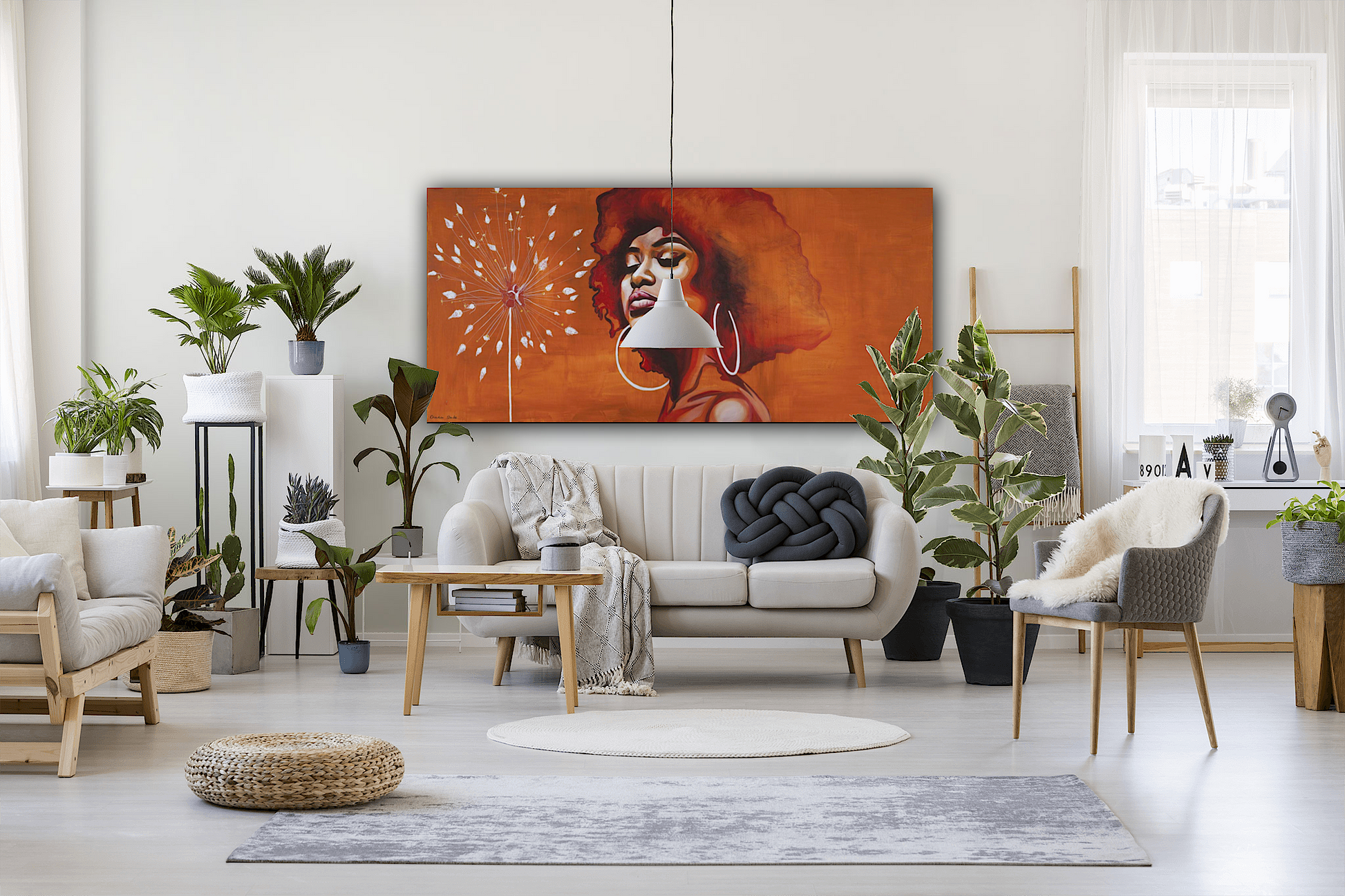 Size matters! Artwork has presence and affects the atmosphere in a space. The size of the artwork is significant, and its size does matter when it comes to visual impact. If the space is large, it’s recommended to choose a painting in a suitable size that won’t disappear within the room. You can consider combining two paintings or creating a wall collage. Pay attention to what you love about the size of the artwork and how it complements the room’s overall design and visual appeal.