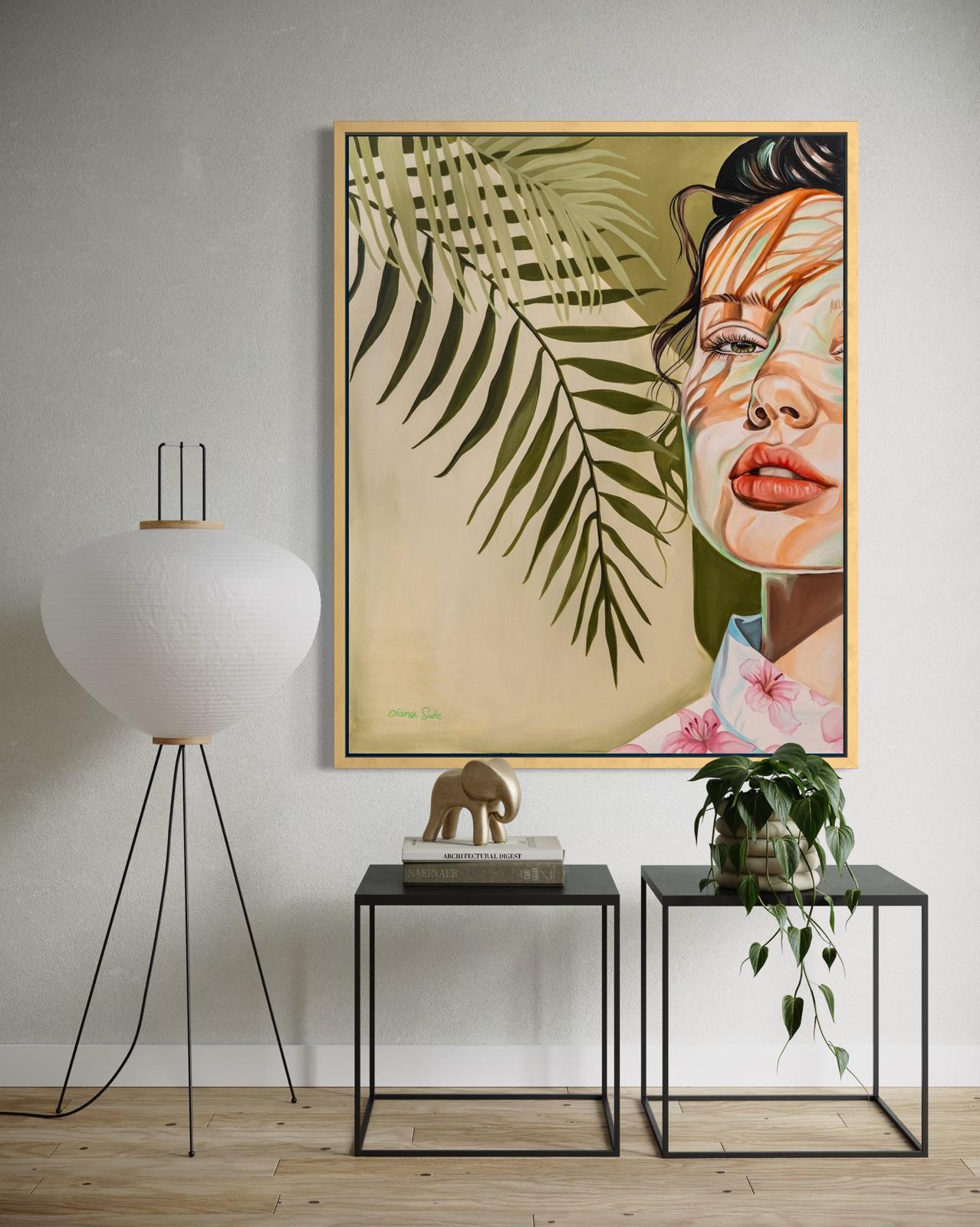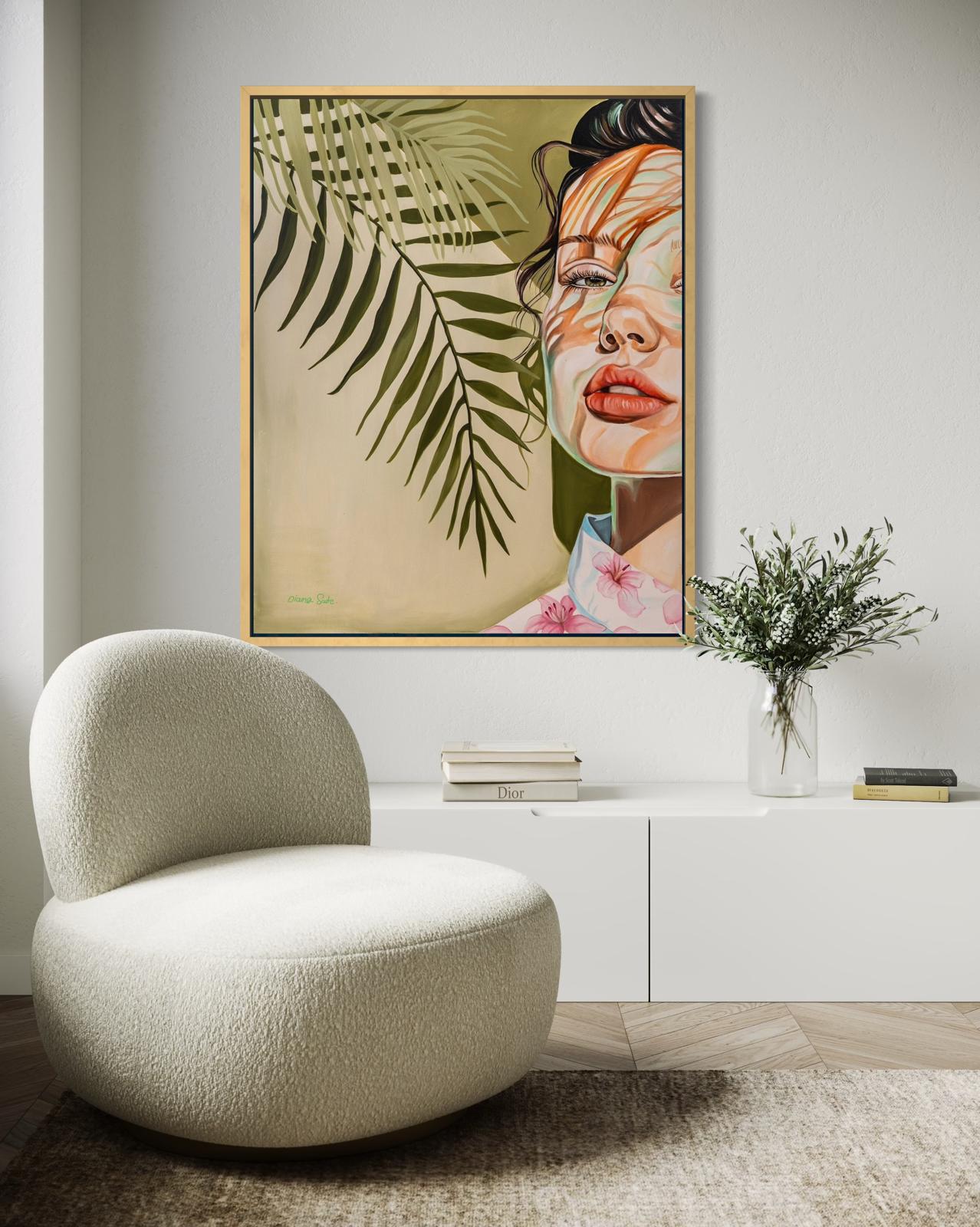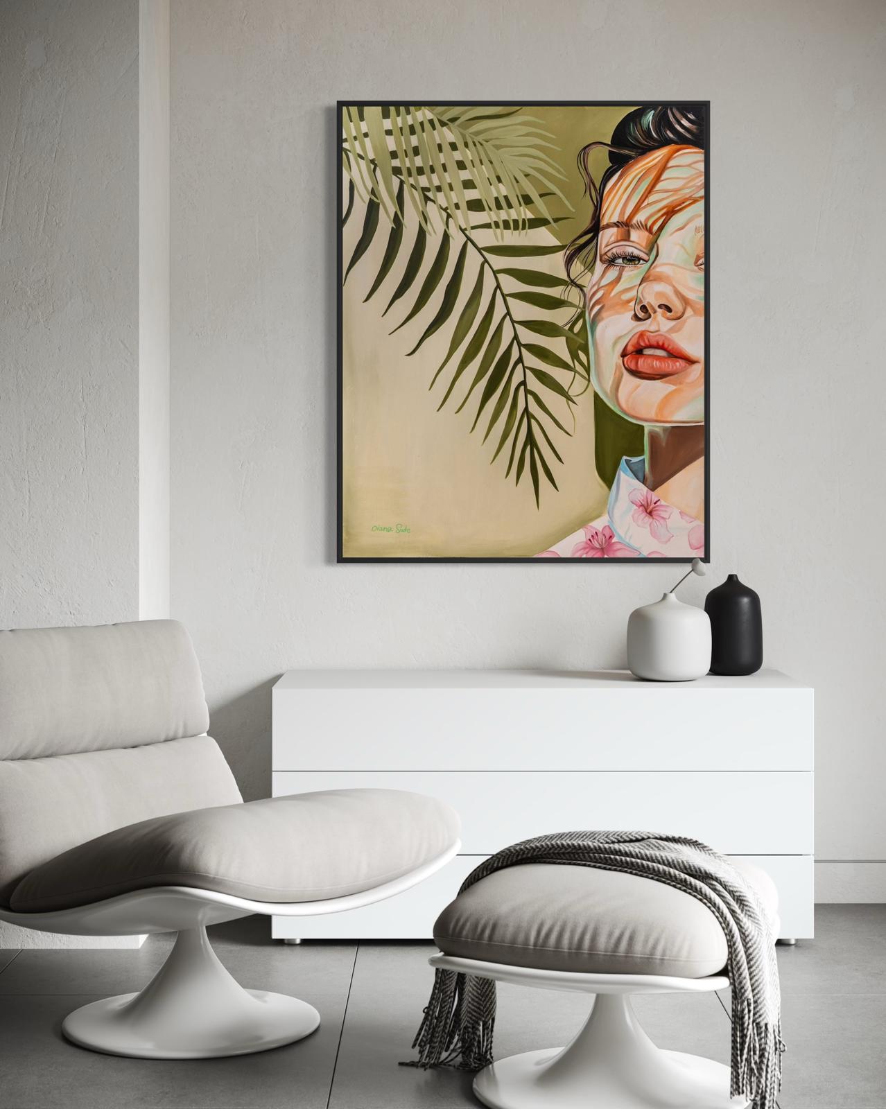 A soft yet striking portrait of a woman partially hidden in the shadows of palm leaves. The interplay of light and shadow on her face creates an almost dreamlike atmosphere, blending nature with human expression. Her calm gaze and the delicate floral pattern on her blouse add to the gentle harmony of this serene composition.